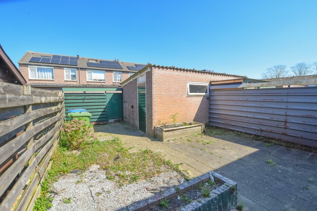 Onderhoudsvriendelijke achtertuin met berging en achterom.