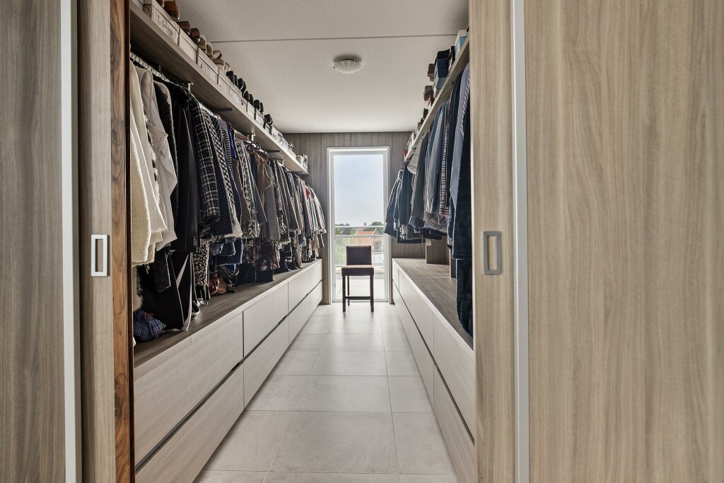 De keuken staat in halfopen verbinding met de woonkamer, met daartussen een praktische berging met opstelling CV-combiketel en verdeler van de vloerverwarming.