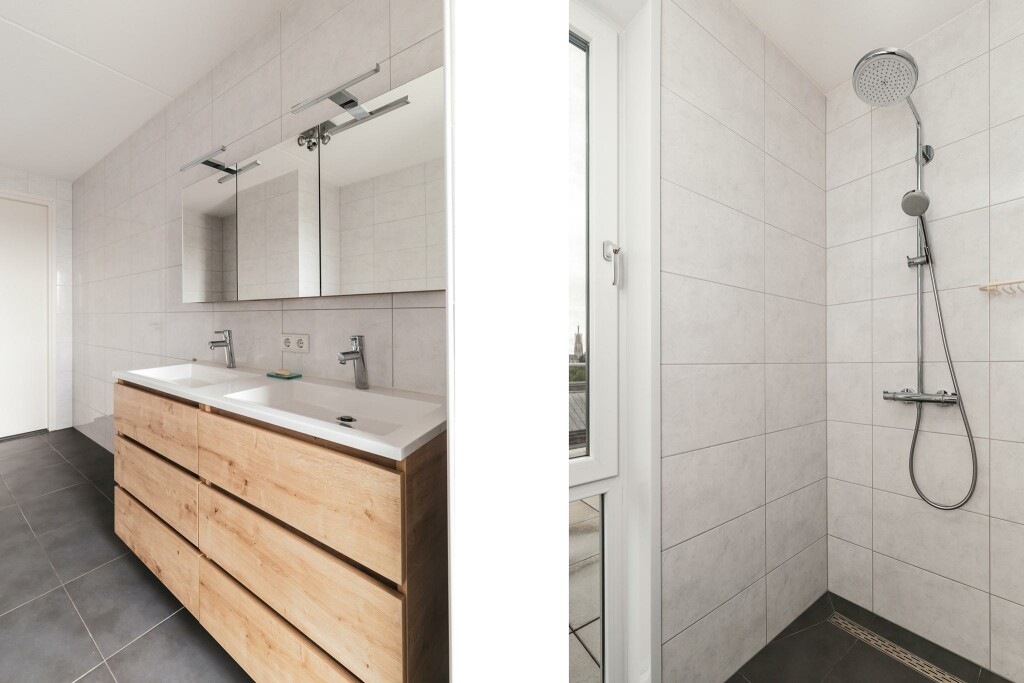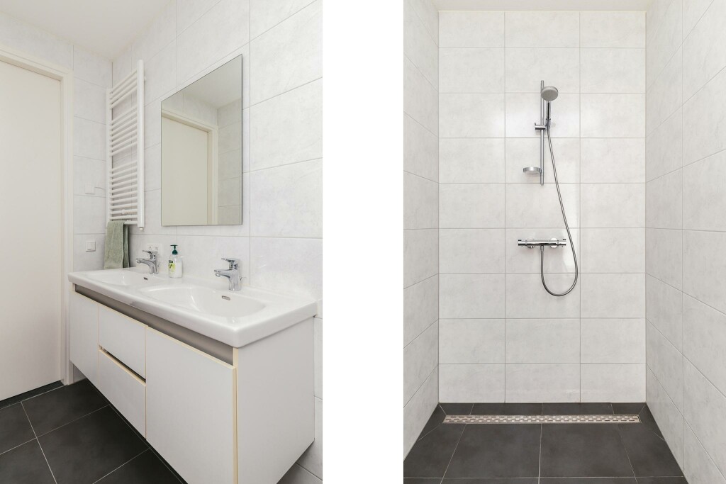 Deze comfortabele badkamer is voorzien van een inloopdouche en wastafelmeubel.