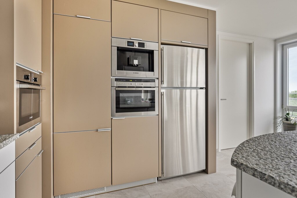 Denk aan een brede inductiekookplaat, geïntegreerde afzuigkap, vaatwasser, oven, magnetron, koelkast, vriezer en een luxe koffieapparaat.