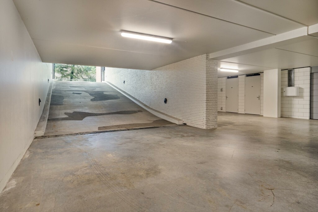 Parkeren kan parkeren kan in de eigen dubbele garagebox in de overdekte parkeerkelder direct onder het gebouw met interne toegang tot de lift naar de woonverdieping.