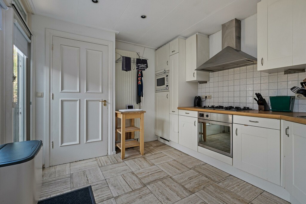 Entree in de hal met tegelvloer en fraai glas-in-lood raam, meterkast en trapopgang. In de hal een deur naar de kelder. De woonkamer heeft een houten vloer, een houthaard, een gezellige erker en een ruime eethoek met schuifpui naar de tuin. Vanuit de woonkamer komt u in de ruime aanbouw. Hier treft eerst de keuken in een hoekopstelling. Deze is voorzien van een 5-pits gasfornuis, oven, afzuigkap, koelkast, vaatwasser, magnetron en een deur naar de tuin. Vanuit de keuken een tussenportaal met het toilet en deur naar de badkamer. De badkamer is voorzien van een ligbad/douche combinatie en dubbele wastafel. Verder treft u hier de wasmachineaansluiting en een geiser voor het warme water van de badkamer en de keuken.
