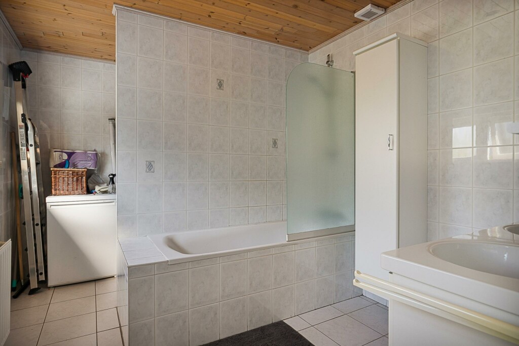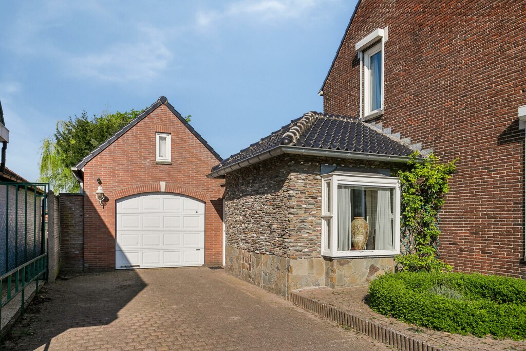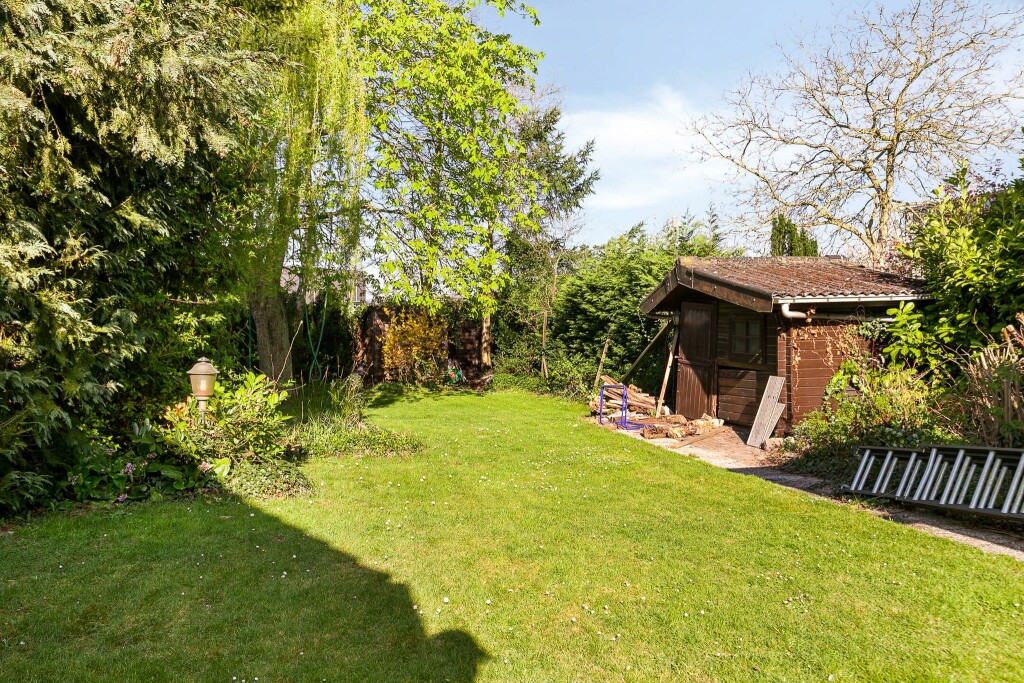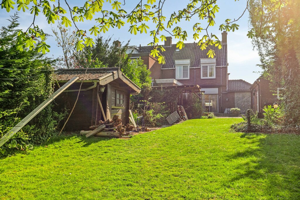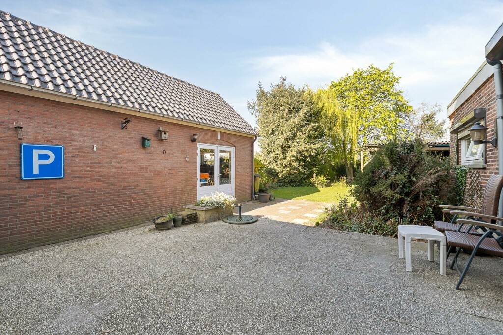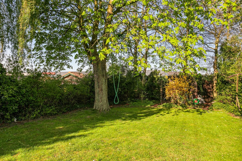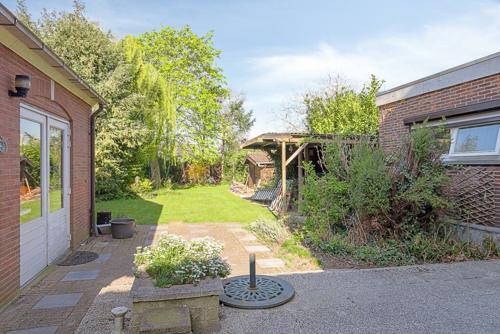 Aansluitend aan de woning een heerlijk groot terras met achterom, vanwaar je heerlijk zicht hebt op de diepe tuin met groot gazon en prachtige grote bomen achterin de tuin. Achter de aanbouw is er een grote overkapping en helemaal achterin de tuin zijn er een 2-tal houthokken met een pomp voor een bron. De diepe garage is voorzien van een elektrische roldeur en heeft een grote bergzolder.