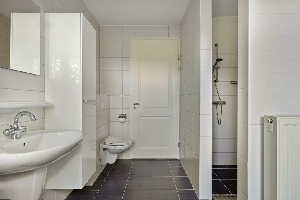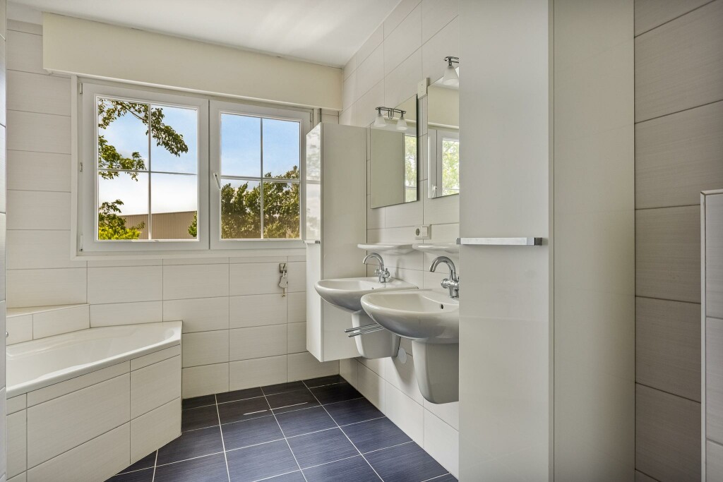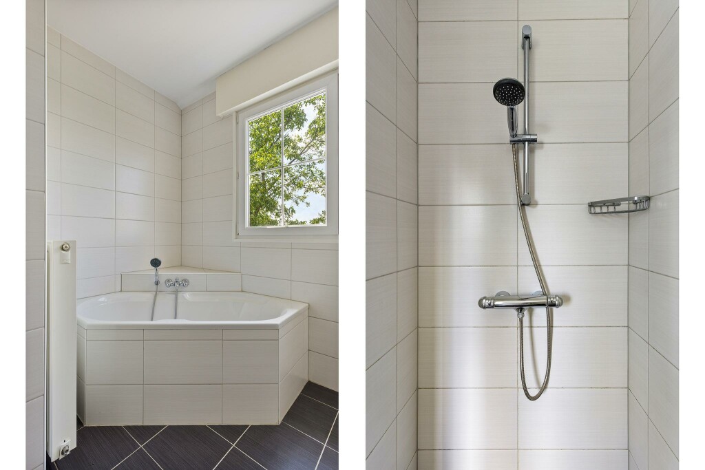 De nette badkamer heeft een inloopdouche, hoekbad, een toilet en 2 wastafels.