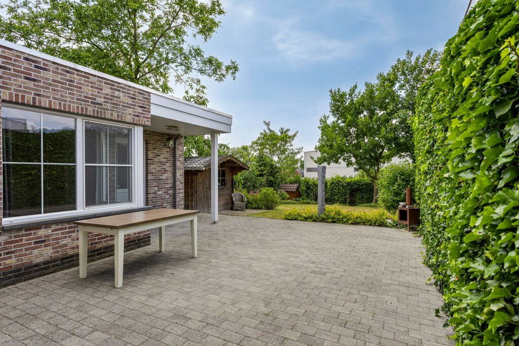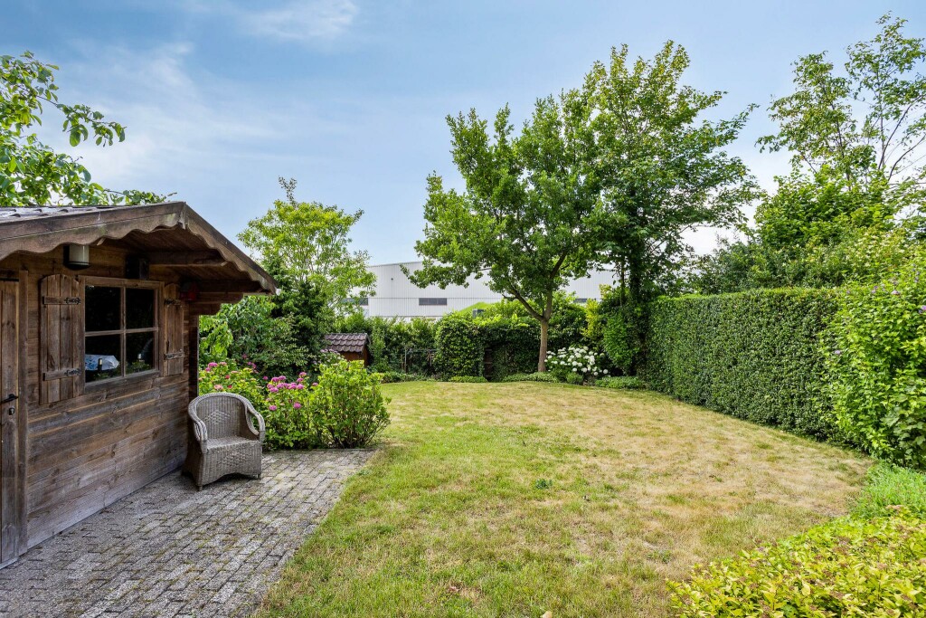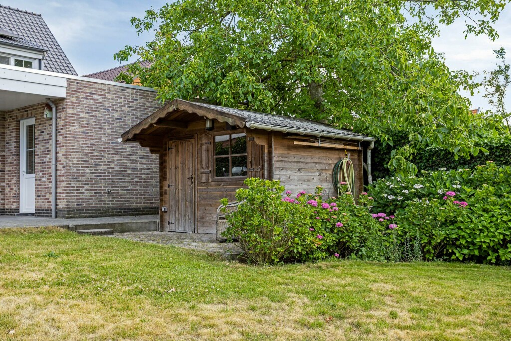 Grenzend aan de woning een groot terras, waarvan een stukje overkapt is. De tuin is heerlijk diep en zonnig en door de hoge hagen biedt deze extra veel privacy. De tuin heeft een groot gazon met fraaie bloemborders en is voorzien van een houten tuinhuis voor extra berging.