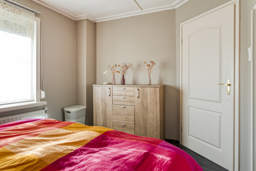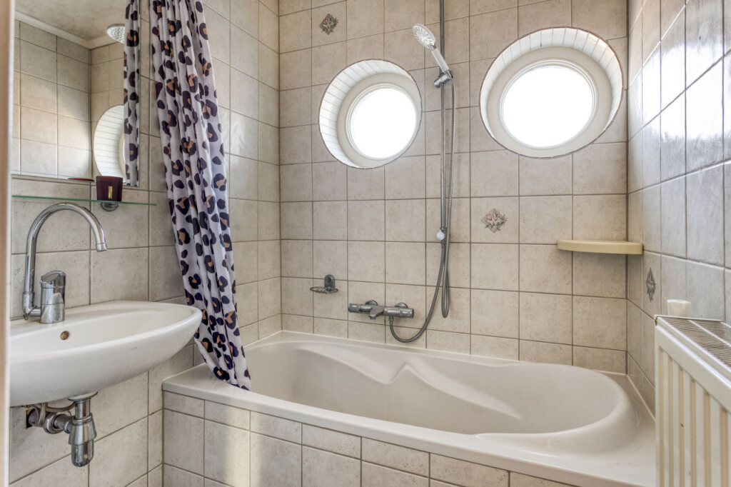 Overloop met toegang tot twee ruime slaapkamers van circa 15 m² en 12 m². Daarnaast is er een derde, kleinere kamer, perfect als kinderkamer, kastenkamer of hobbyruimte. De badkamer beschikt over een ligbad met douche-inrichting en een modern wastafelmeubel.