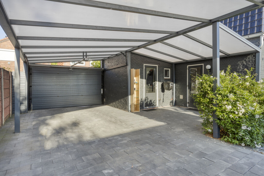 De moderne aluminium carport met brede sectionaaldeur biedt volop ruimte voor meerdere autoâs en zorgt voor veilig en comfortabel parkeren op eigen terrein. Dankzij de overkapping die de carport met de woning verbindt, stap je altijd droog en beschut naar binnen, ideaal bij regenachtig weer.