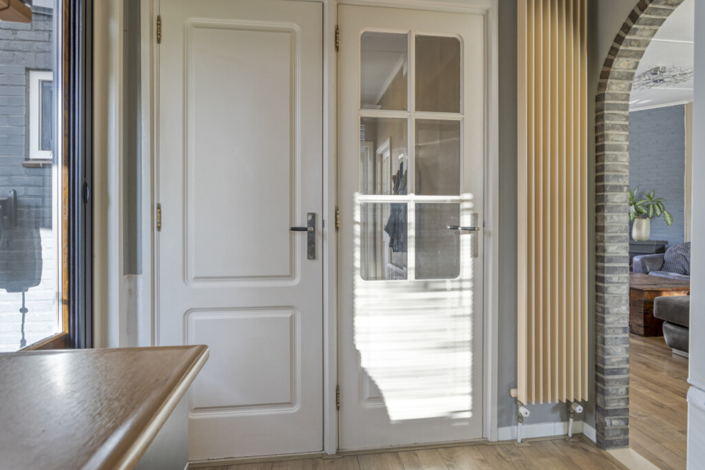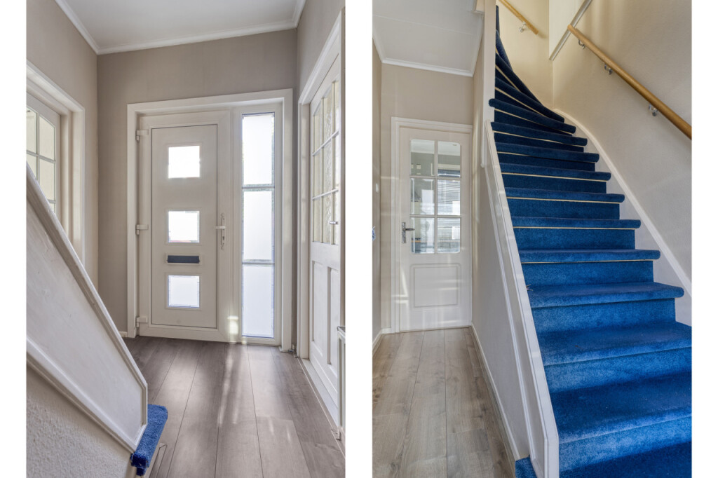 Entree met hal en toegang tot de praktische bijkeuken, voorzien van witgoedaansluitingen, een toilet, meterkast en veel bergruimte.