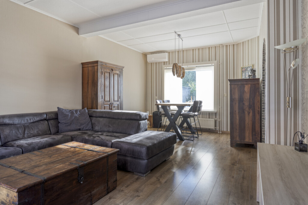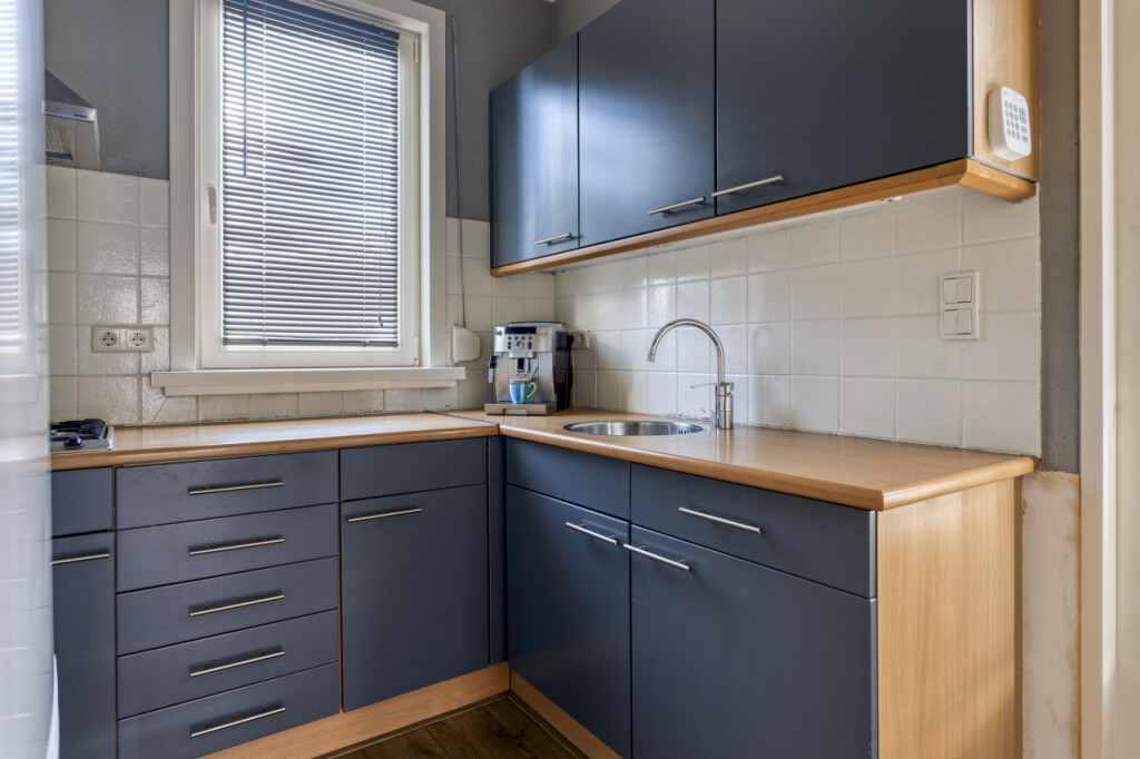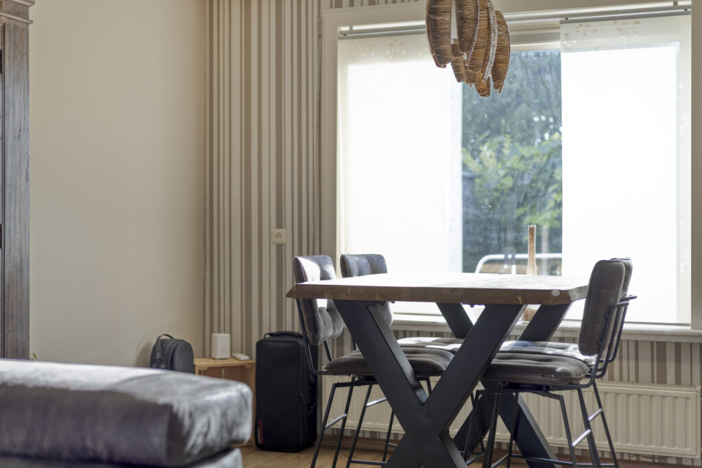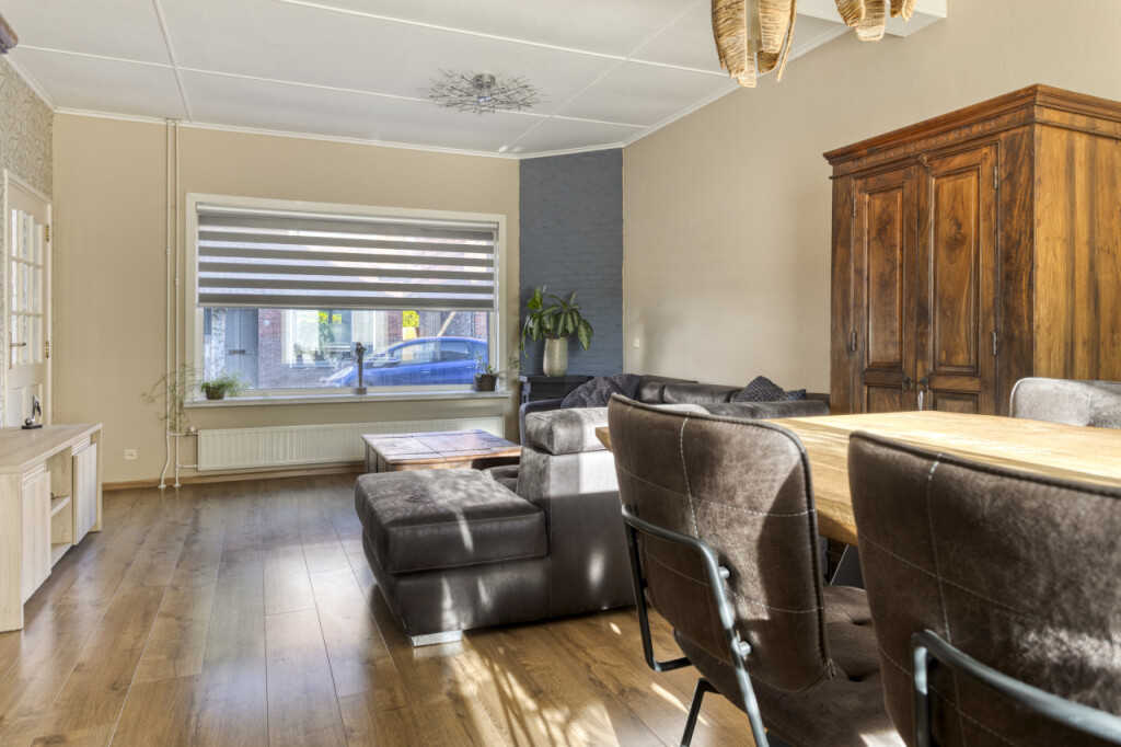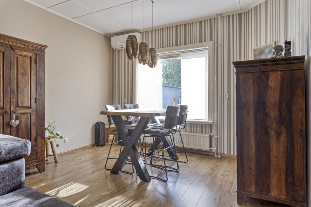 De sfeervolle woonkamer vormt het hart van het huis, met een gezellige eethoek en veel lichtinval. De compacte maar complete keuken is uitgerust met diverse inbouwapparatuur en extra opbergruimte in de kelderkast.