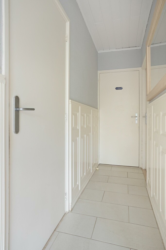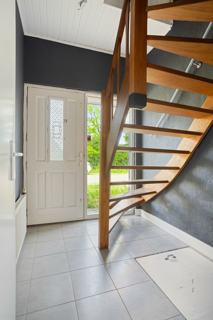 Entree in de hal met tegelvloer, trapopgang en luik naar een kleine kruipkelder.
