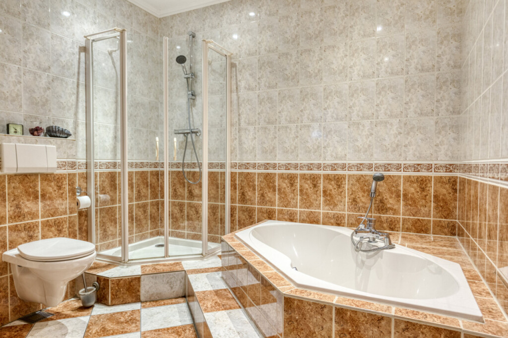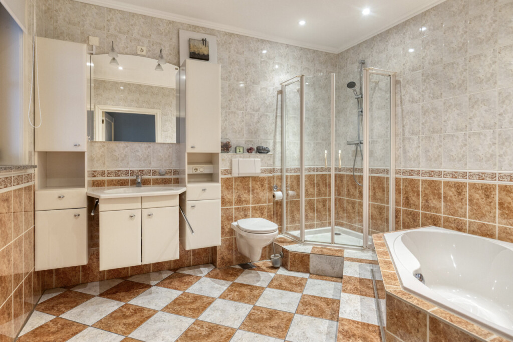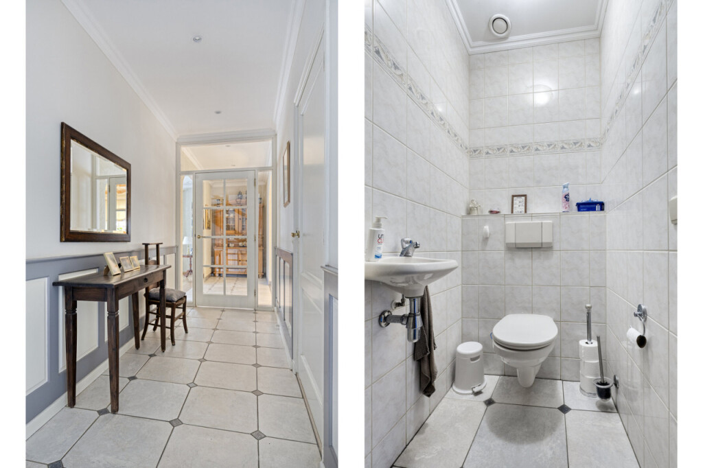 Bij binnenkomst heb je direct toegang tot het toilet. De lange gang aan de linkerzijde leidt je langs de diverse vertrekken, waaronder de eerste slaapkamer met badkamer en suite. Deze badkamer is uitgerust met een bad, douche, toilet en wastafel met meubel.