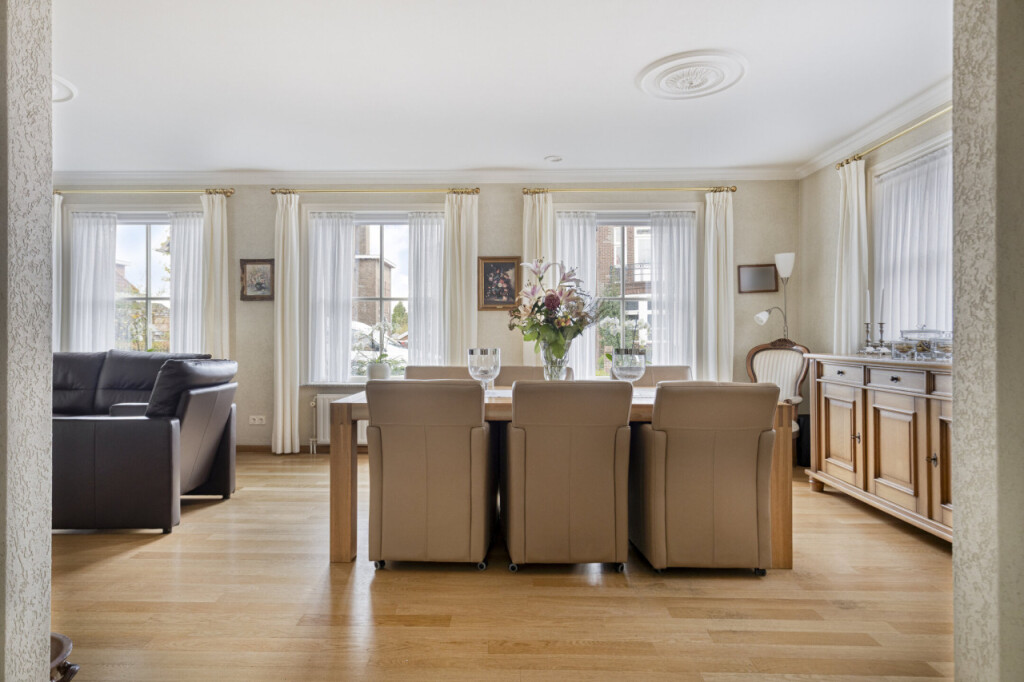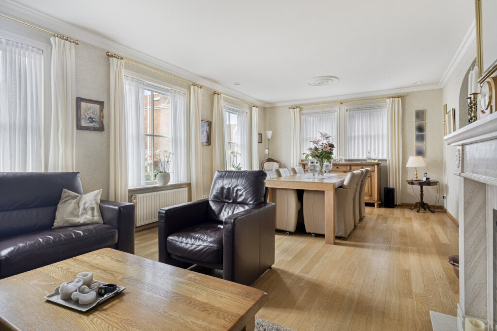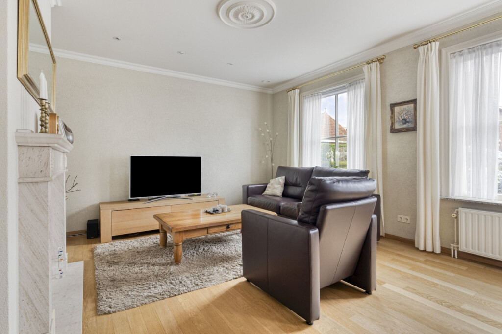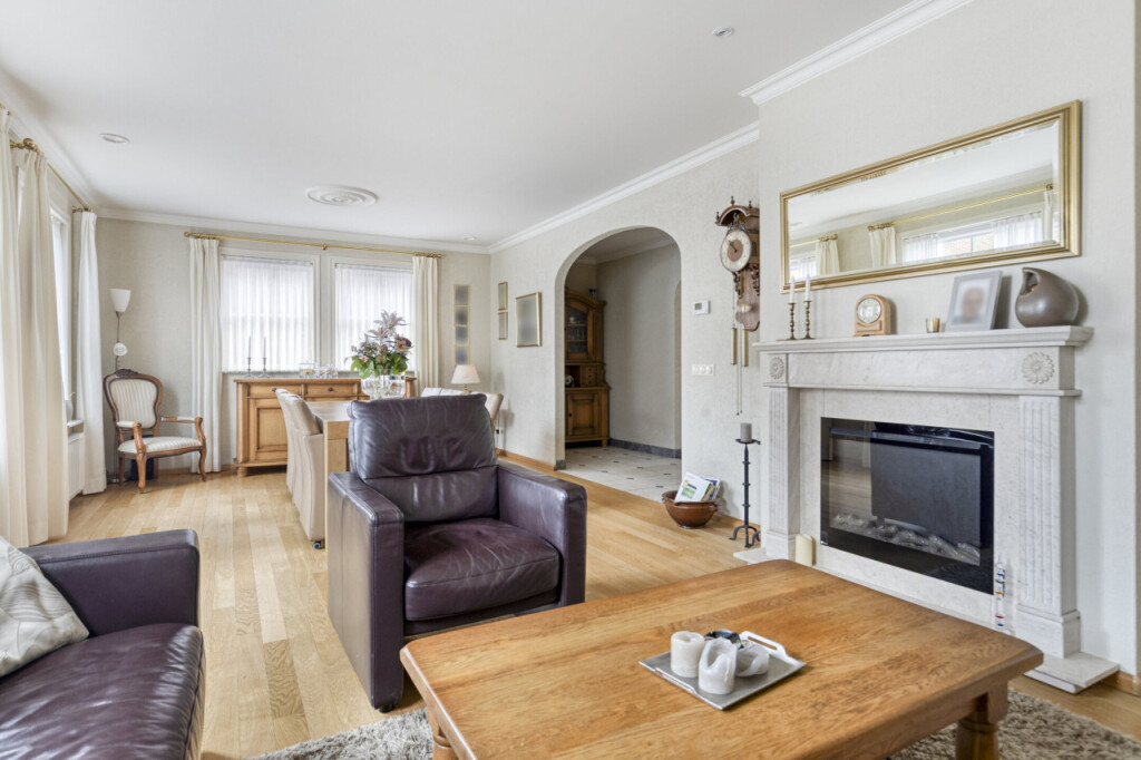 Verderop in de gang vind je links de ruime, lichte woonkamer. De vele ramen zorgen voor een prettige lichtinval en de elektrische haard geeft extra sfeer en warmte.