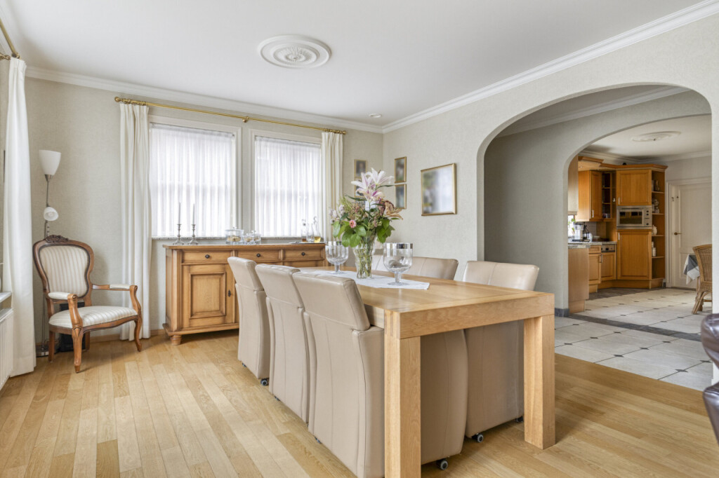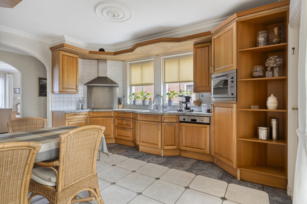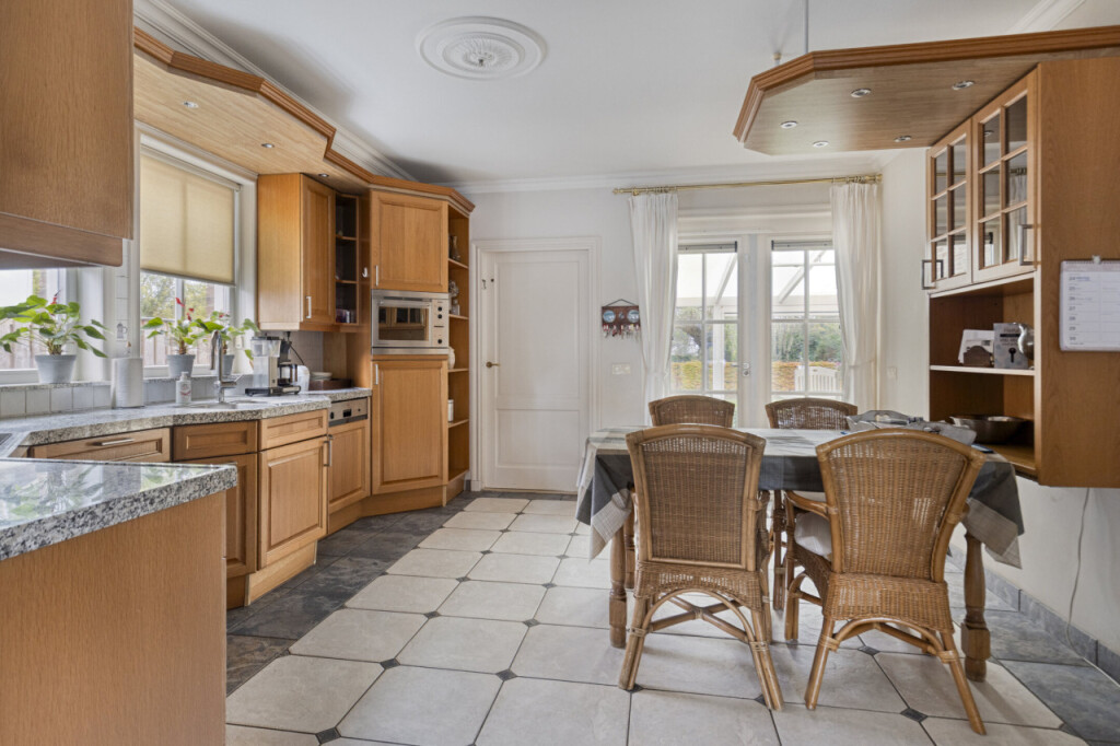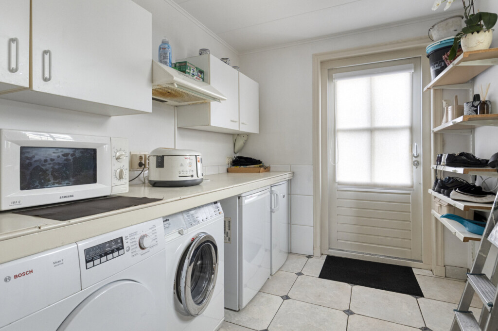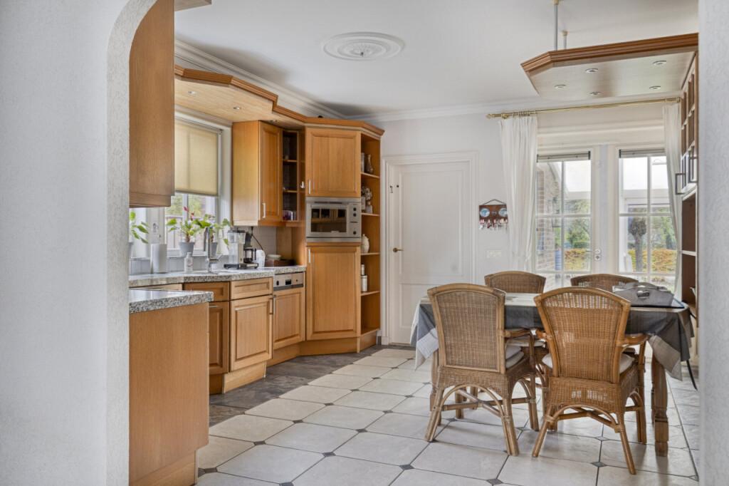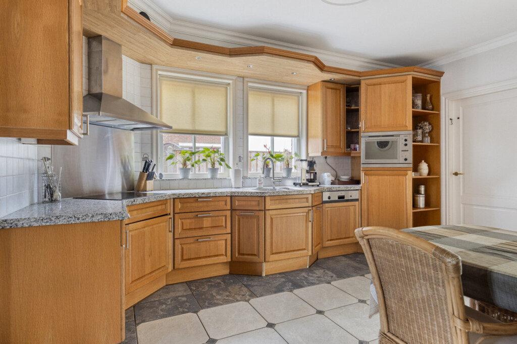 Aan de rechterzijde van de gang ligt de ruime keuken, voorzien van een granieten werkblad, keramische kookplaat, vaatwasser, oven en koelkast. Aansluitend bevindt zich de bijkeuken, met voldoende ruimte voor een extra koelkast of vriezer. Hier vind je ook de aansluitingen voor de wasmachine en droger.