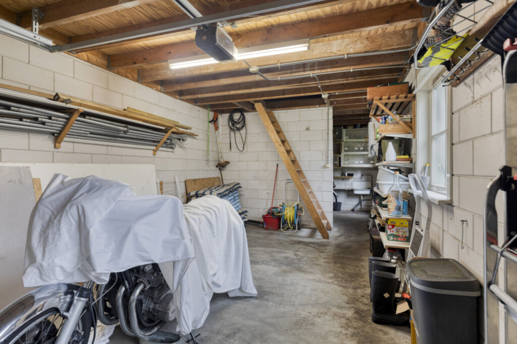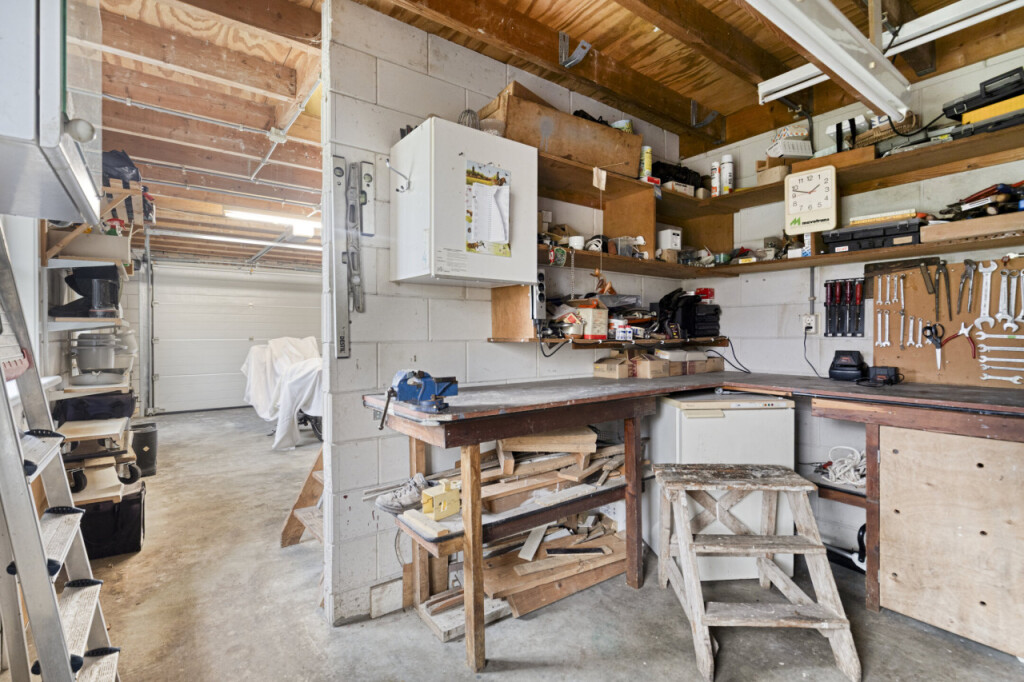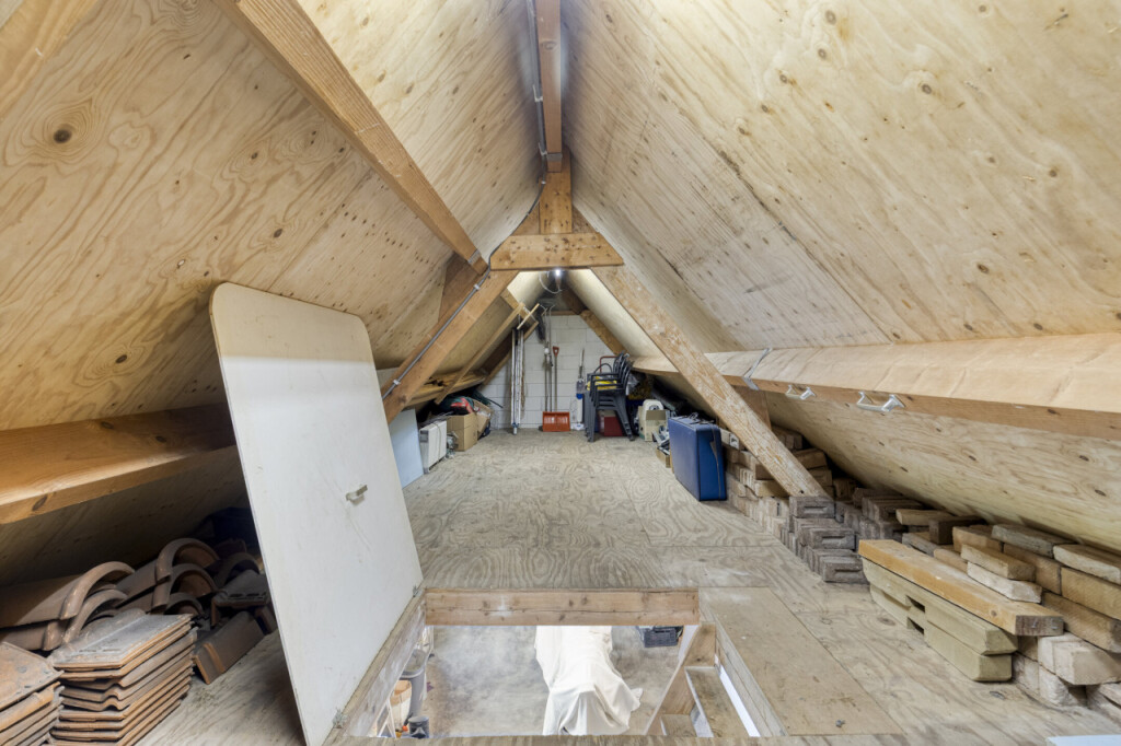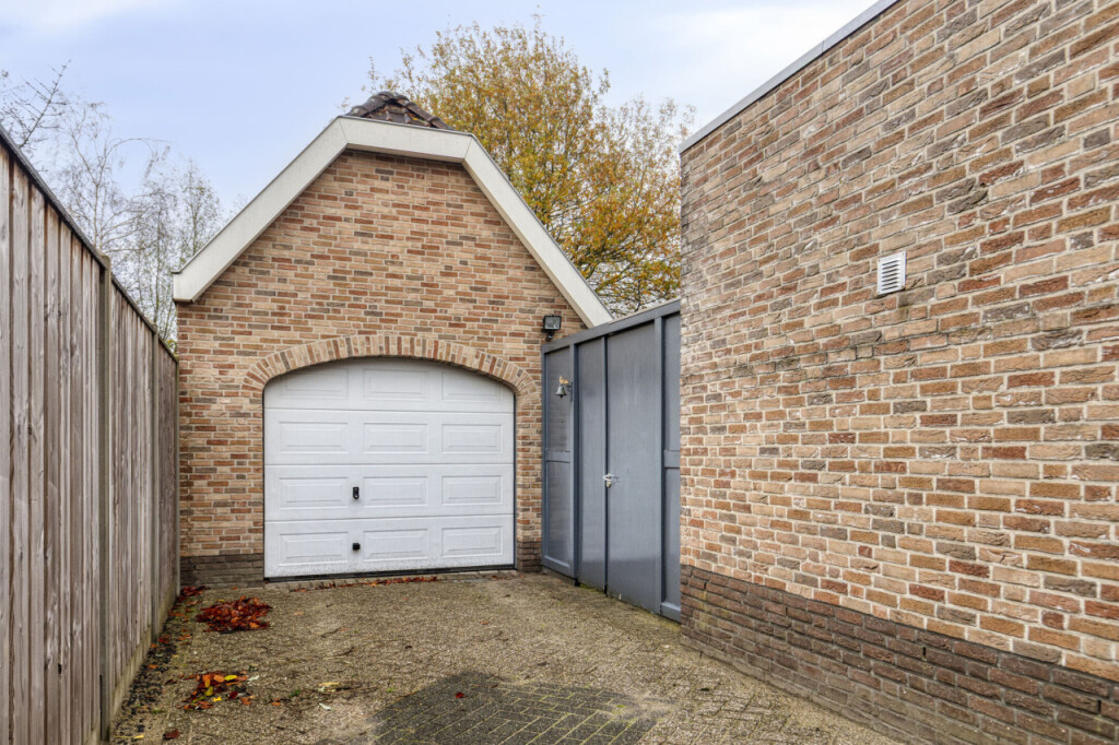 De vrijstaande garage is volledig uitgerust met verwarming, elektra, water, vliering en een elektrische poort. Hier kun je moeiteloos een auto en fietsen kwijt. De oprit biedt daarnaast ruimte voor meerdere auto\'s.