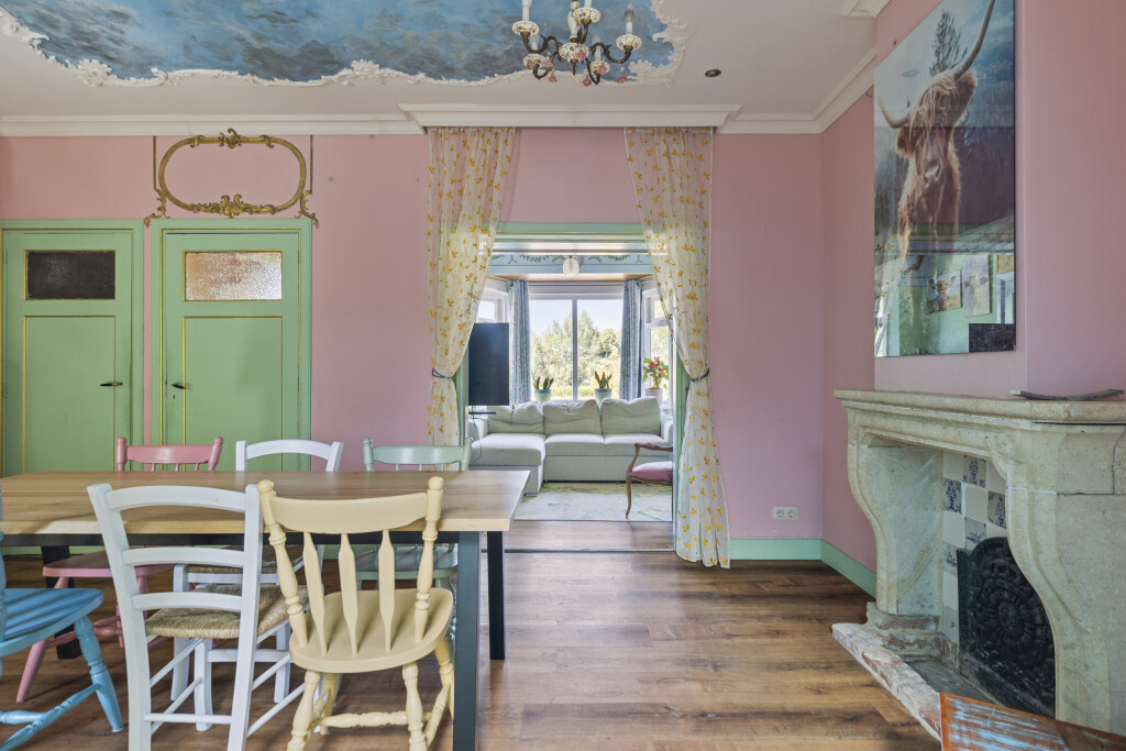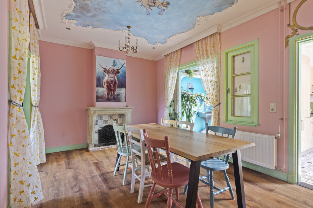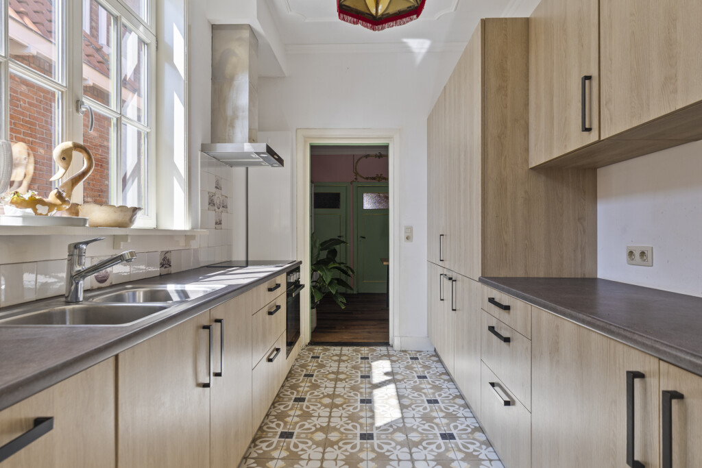 De keuken (2020) combineert hedendaags gemak met een knipoog naar het verleden. Denk aan een dubbele spoelbak, moderne inbouwapparatuur en klassieke details in tegels en afwerking. Vanuit de eetkamer bereik je de aanbouw: een riante ruimte van ruim elf meter lang met praktische kastenwand en dubbele tuindeuren.