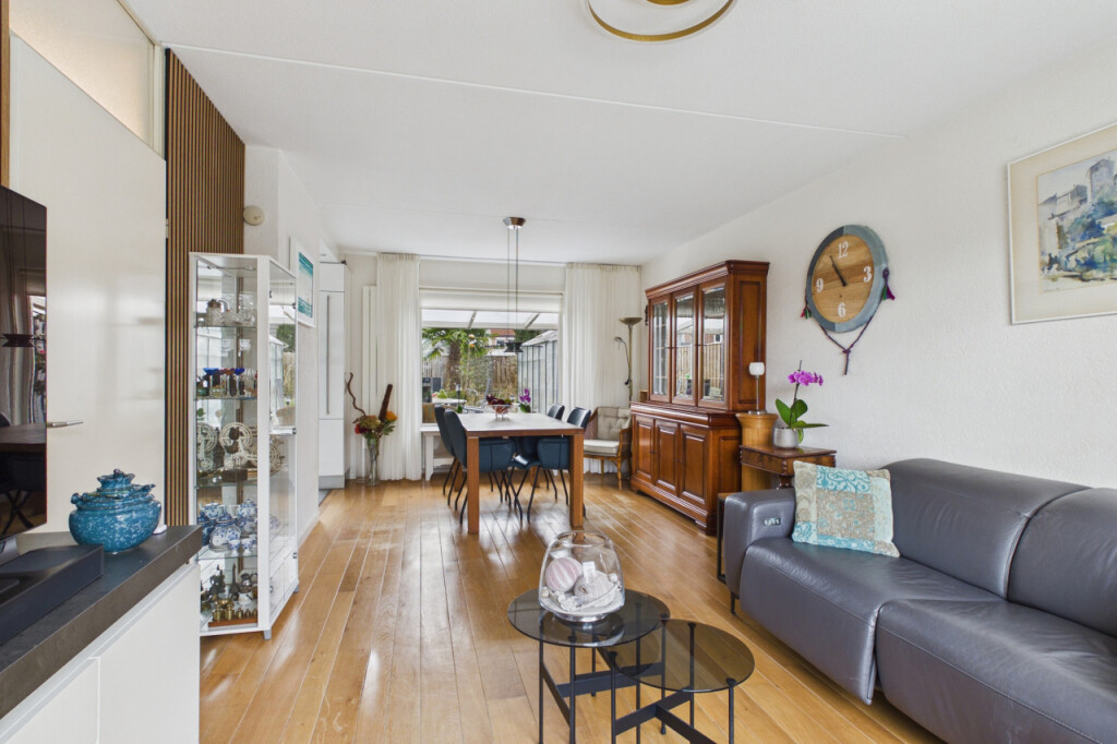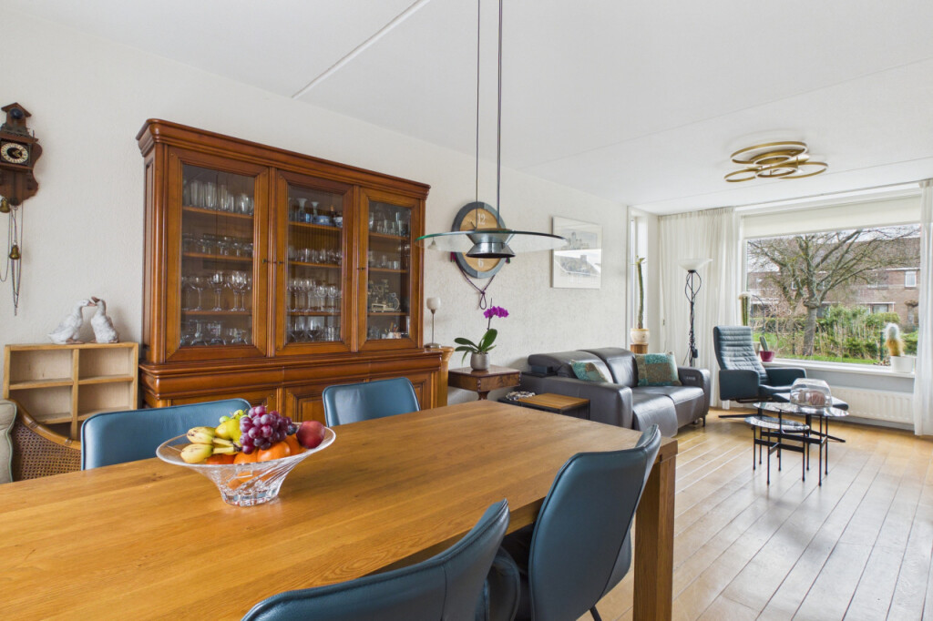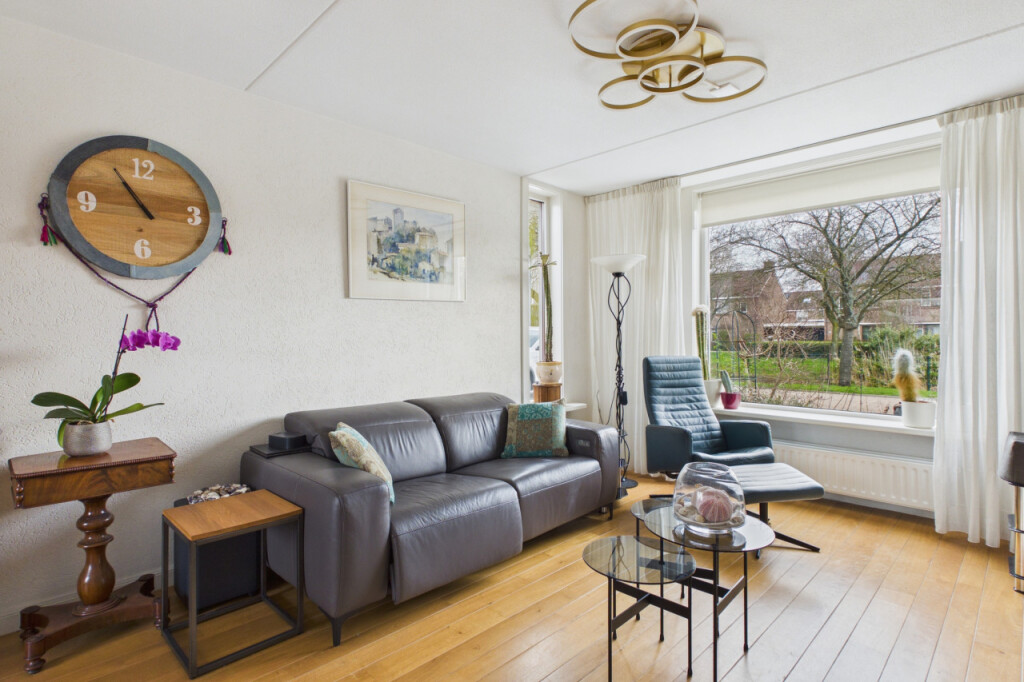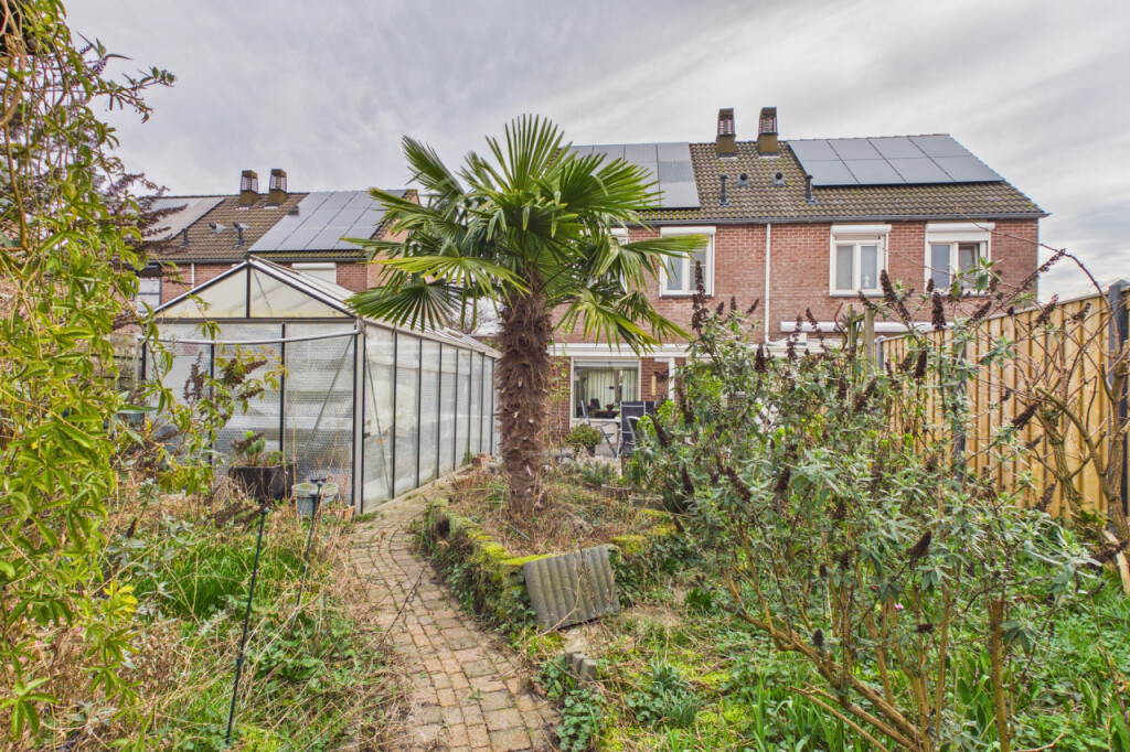 De ruime achtertuin, met eigen achterom, is gelegen op het westen, waardoor je hier volop van de middag- en avondzon kunt genieten. De tuin is verzorgd aangelegd met een terras en diverse bloem- en plantenborders, wat zorgt voor een sfeervol geheel. De aangebouwde overkapping aan de woning vormt een heerlijke verlenging van de leefruimte; hier kun je ook met wat minder weer comfortabel buiten zitten en genieten van het buitenleven. Daarnaast is er een kas aanwezig voor de liefhebber van tuinieren. Vanuit de tuin heb je toegang tot de ruime garage, welke is voorzien van elektra en een extra keukenblok, ideaal voor hobby’s, opslag of extra werkruimte.