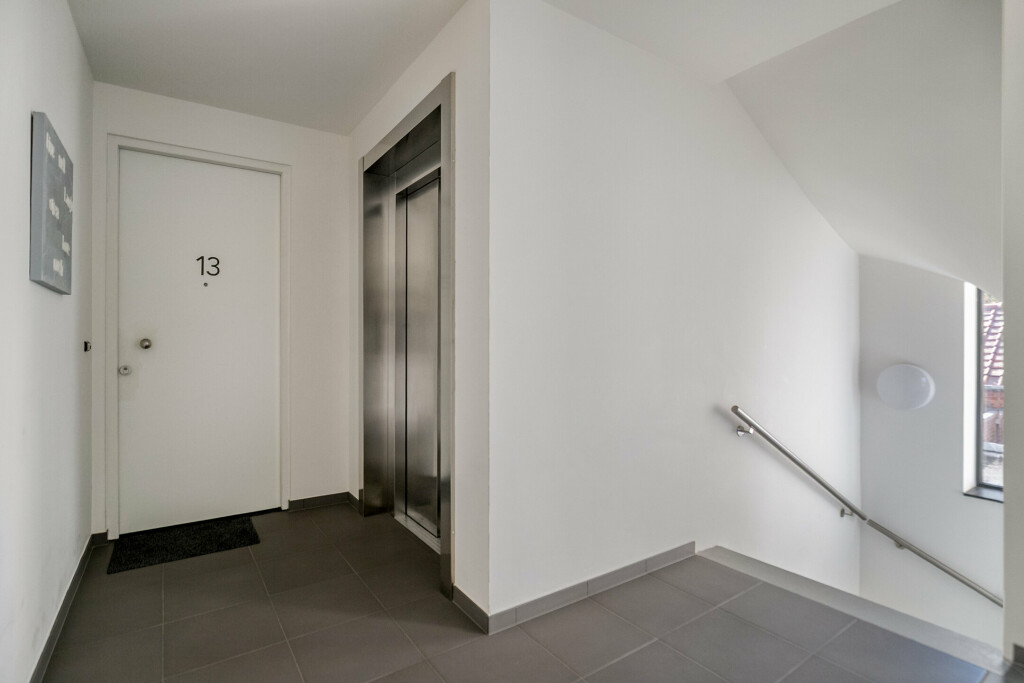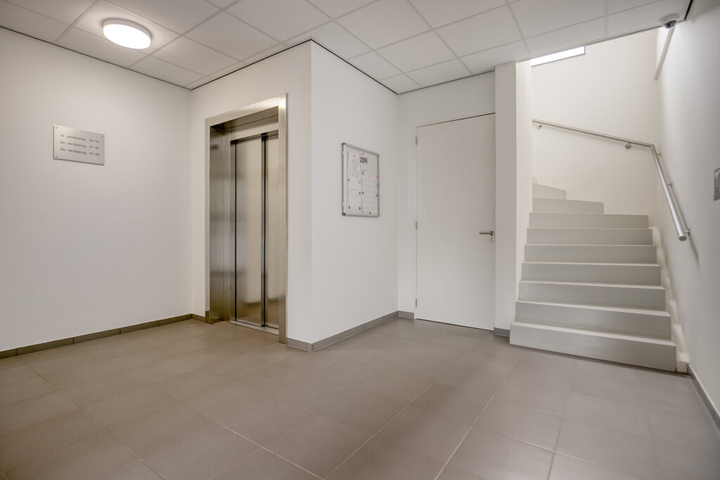 Het complex is uitstekend toegankelijk. Via een automatische buitendeur stap je binnen in de ontvangsthal met brievenbussen en een moderne video-intercom. Een tweede automatische deur brengt je naar de centrale hal, waar je de trap of de lift naar de 1e verdieping neemt. De hal voor het appartement deel je met slechts één andere bewoner – ideaal voor extra rust en privacy.