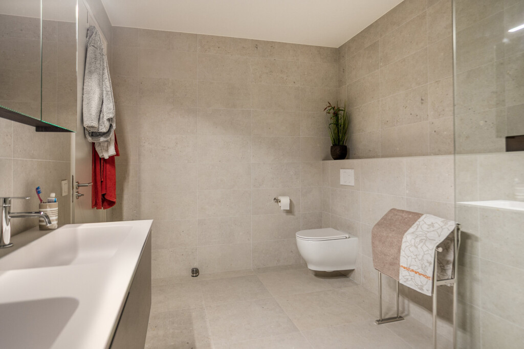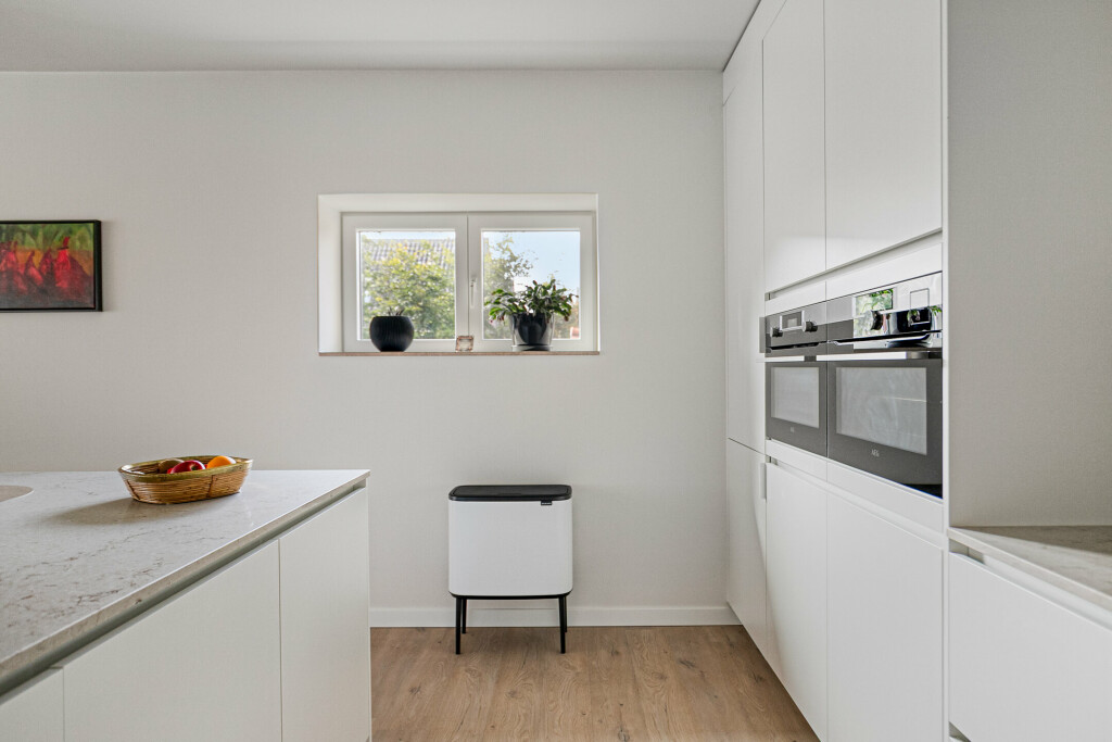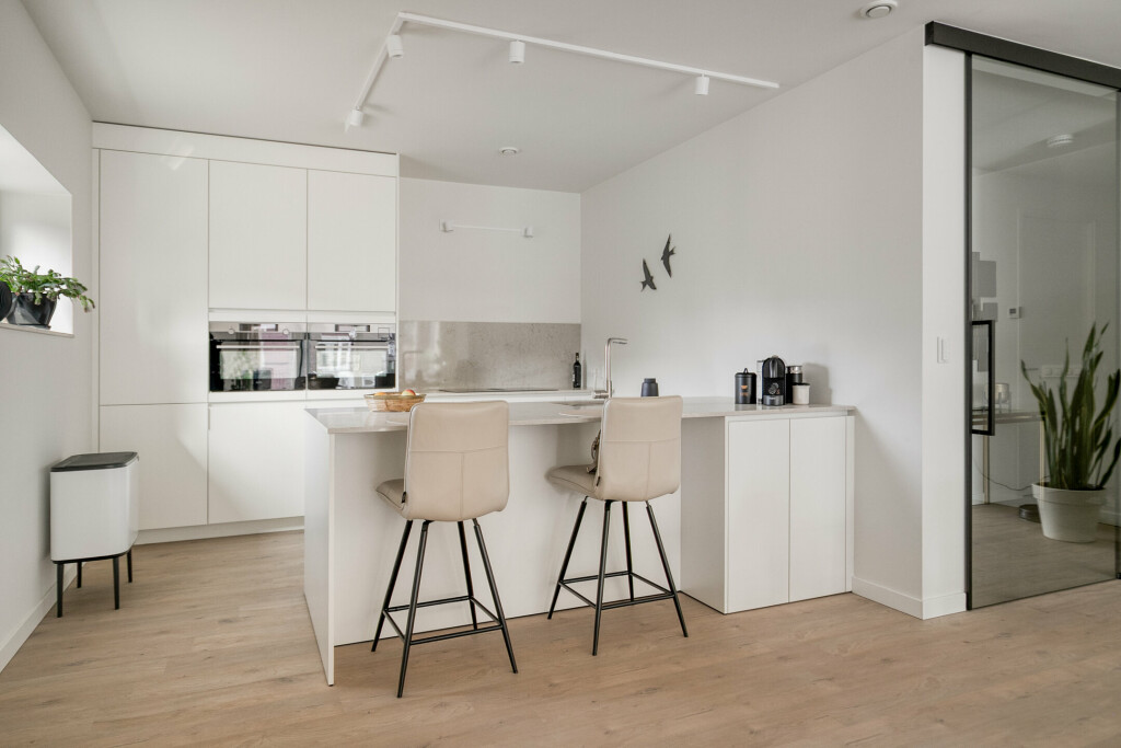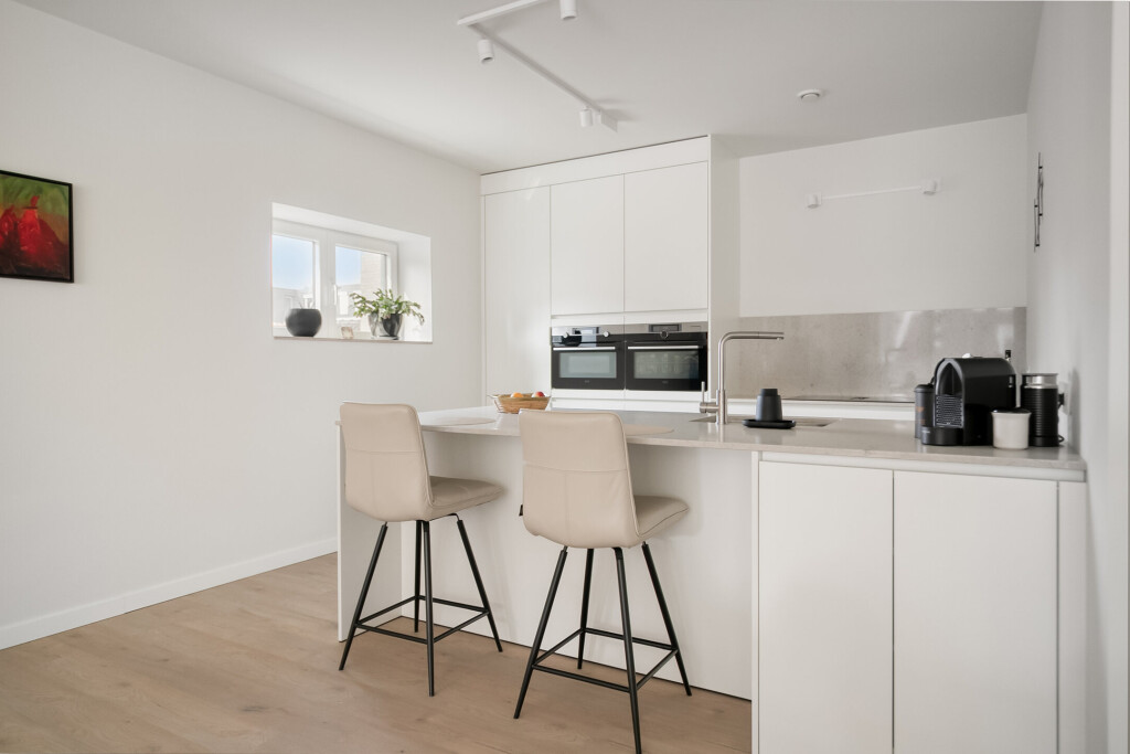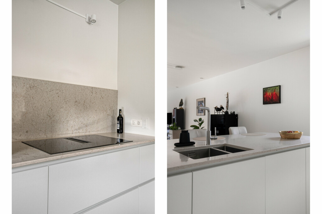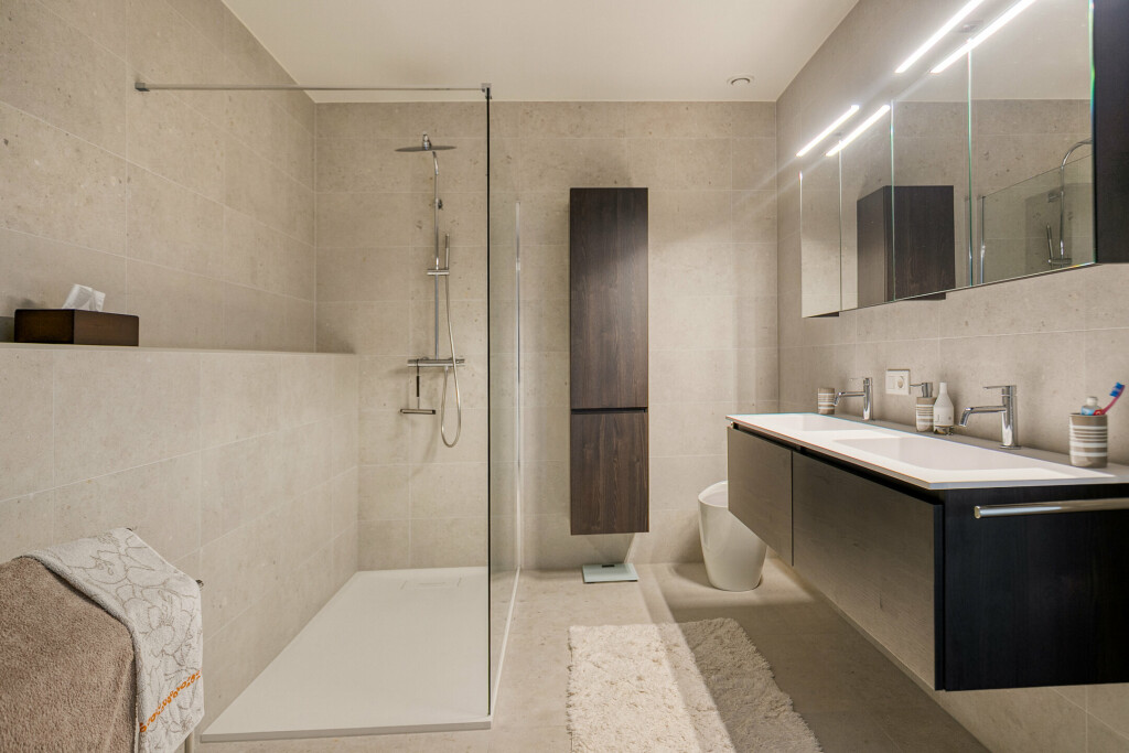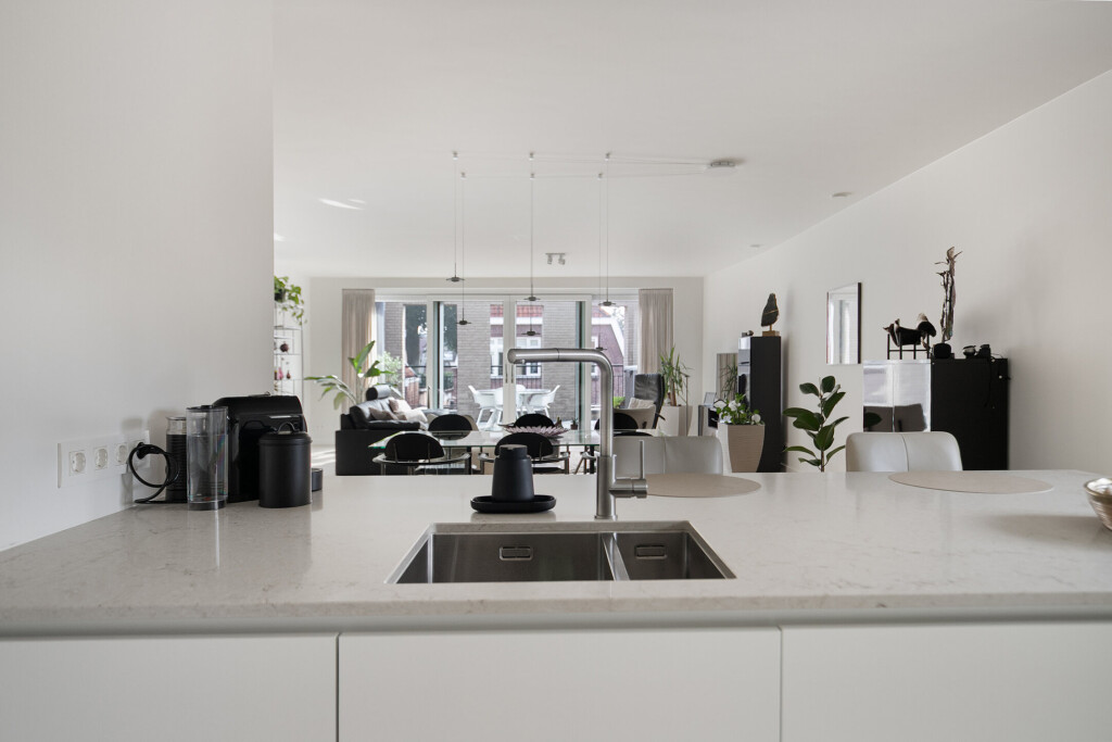 De luxe keuken, met spoeleiland, is voorzien van een Dekton werkblad en alle denkbare inbouwapparatuur van het merk AEG zoals een inductiekookplaat met afzuiging, stoomoven, combi-oven, koelkast, vriezer en vaatwasser. De badkamer is modern en comfortabel ingericht, met een ruime inloopdouche, een breed wastafelmeubel met dubbele kraan en spiegelkast, kolomkast en een toilet.