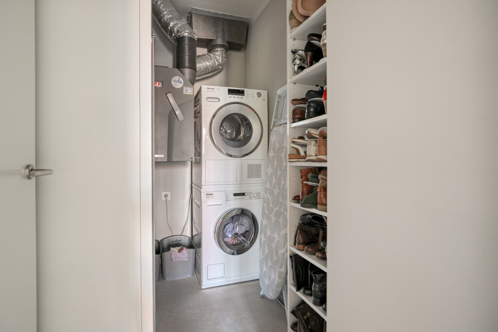 Je betreedt het appartement via de ruime hal die toegang biedt tot alle vertrekken: een apart toilet, 2 slaapkamers, een luxe badkamer en de royale, lichte woonkamer met open keuken en toegang tot het ruime balkon. Vanuit de hal is tevens de technische ruimte met warmtepomp en aansluitingen voor wasmachine en droger bereikbaar.