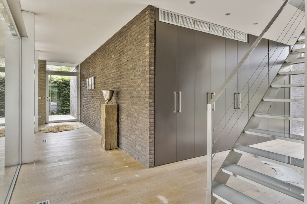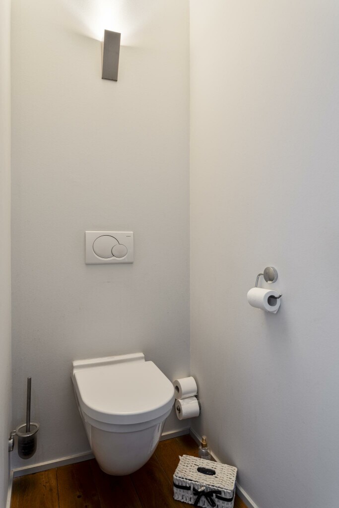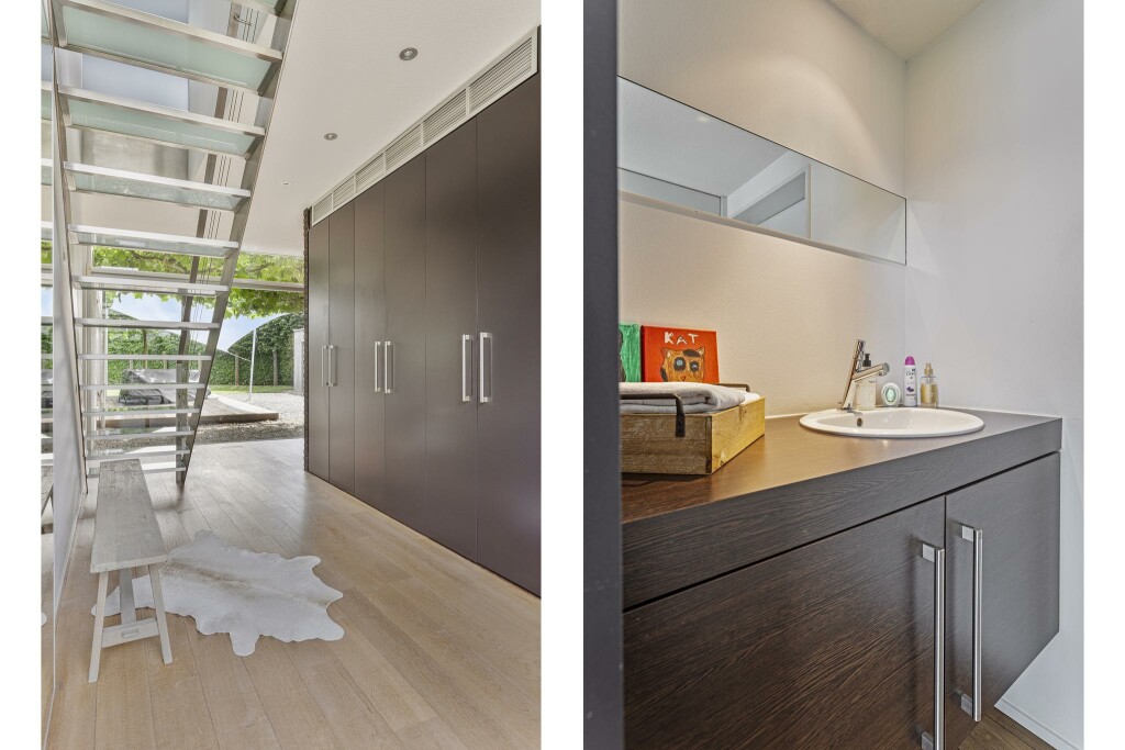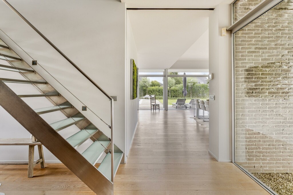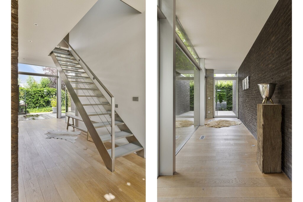 Via de indrukwekkende entree, waar glas en metselwerk elkaar elegant aanvullen, wordt u hartelijk ontvangen. In de hal vindt u een stijlvolle garderobe met maatwerkkasten, het gastentoilet en de fraaie trap naar de verdieping.