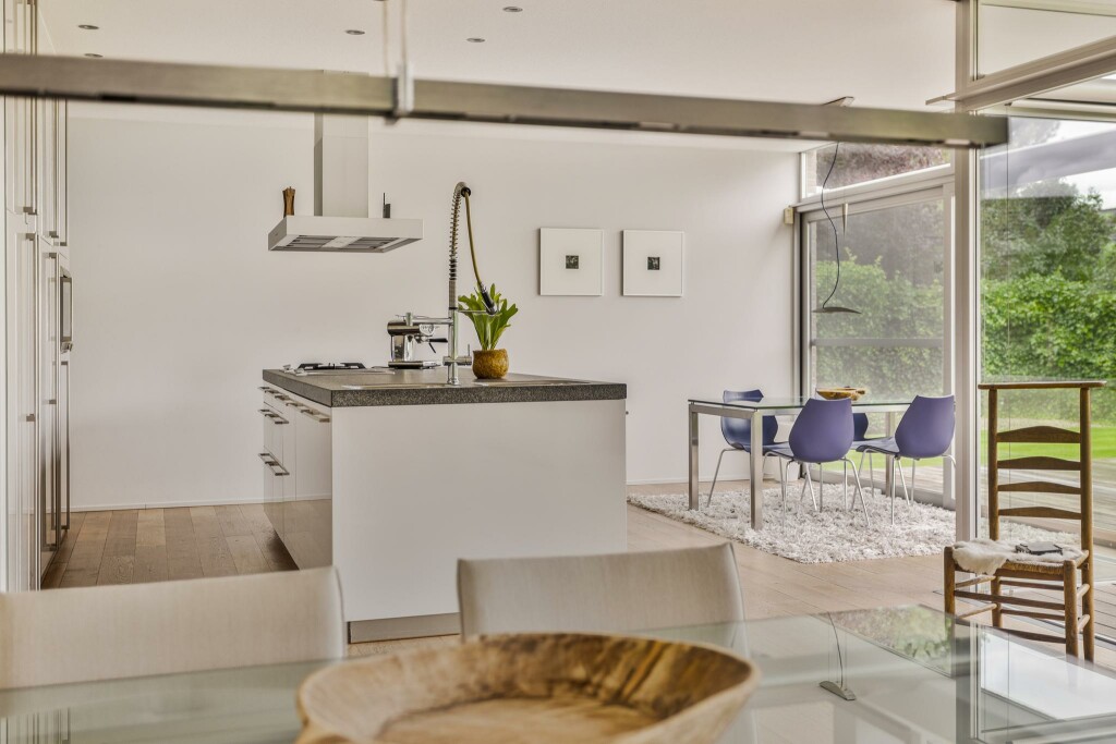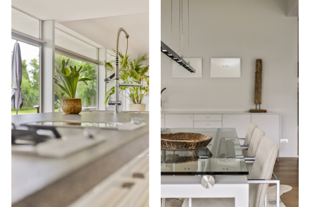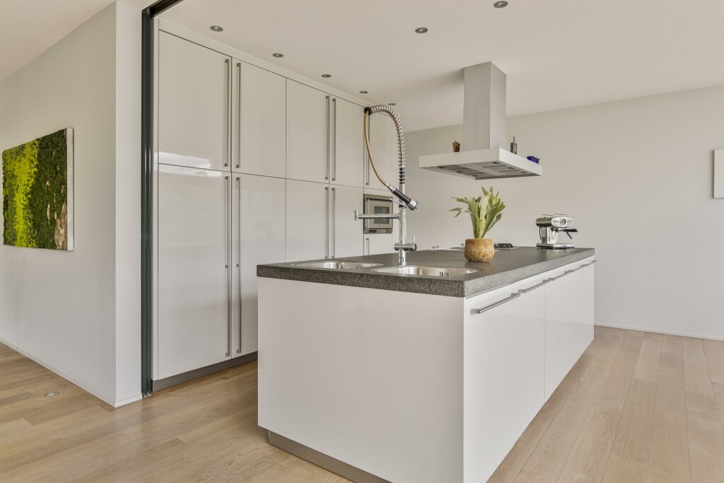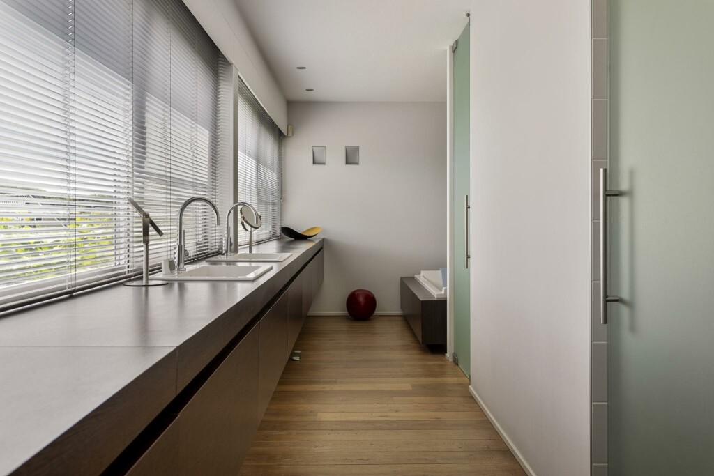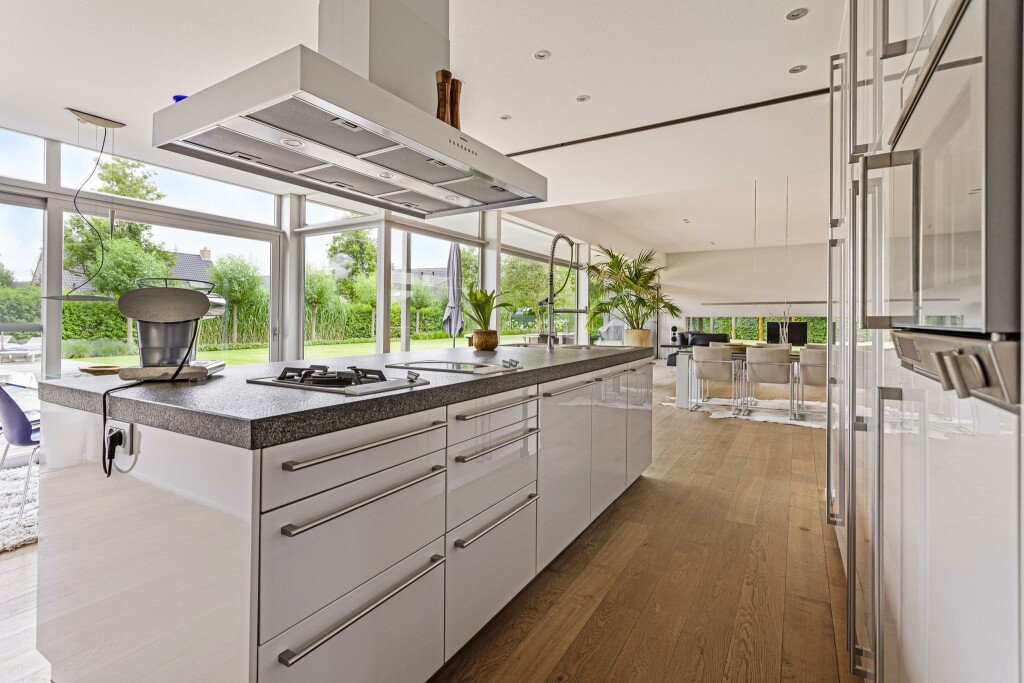 De moderne leefkeuken vormt het hart van de woning. Het centraal geplaatste kook- en spoeleiland nodigt uit tot samenzijn, koken en genieten. De ruimte kan met een glazen schuifwand subtiel worden afgesloten van de woonkamer, wat flexibiliteit biedt in het gebruik van beide zones. Een strakke kastenwand met hoogwaardige inbouwapparatuur maakt het geheel compleet.