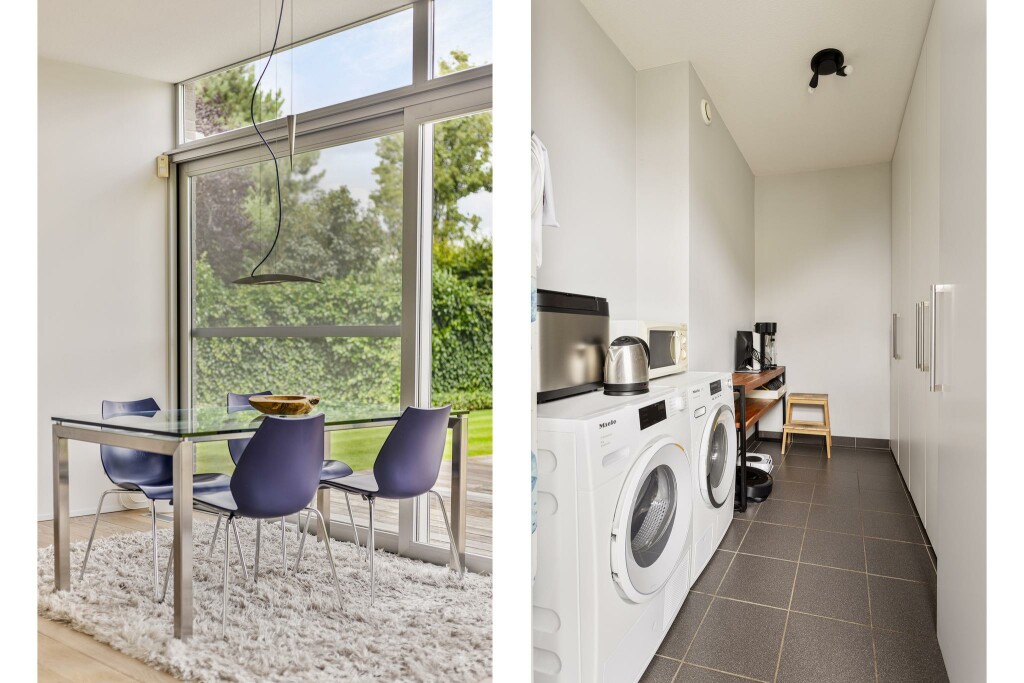 Aansluitend aan de keuken bevindt zich een praktische bijkeuken met veel opbergruimte. Vanuit het naastgelegen portaal bereikt u eenvoudig de royale dubbele garage.
