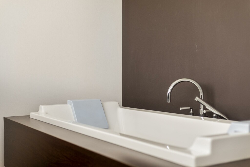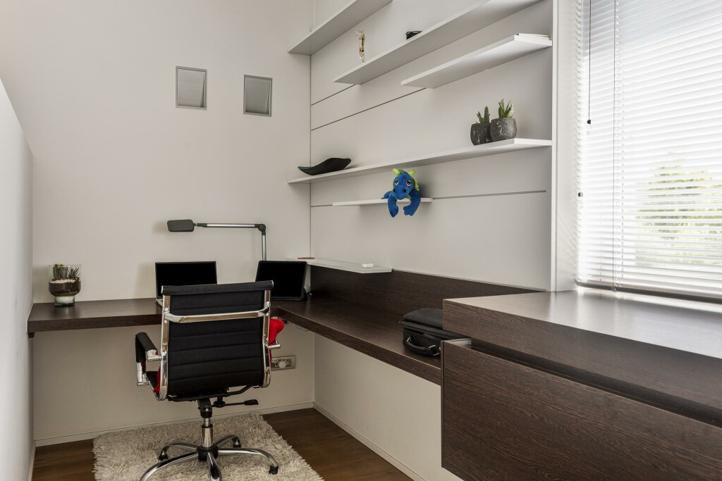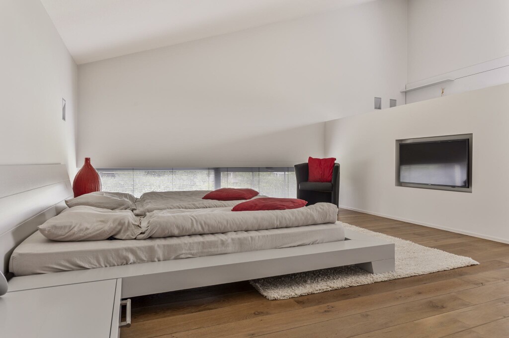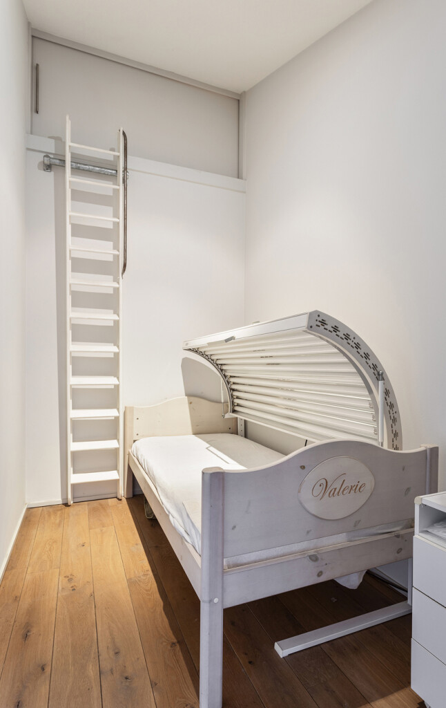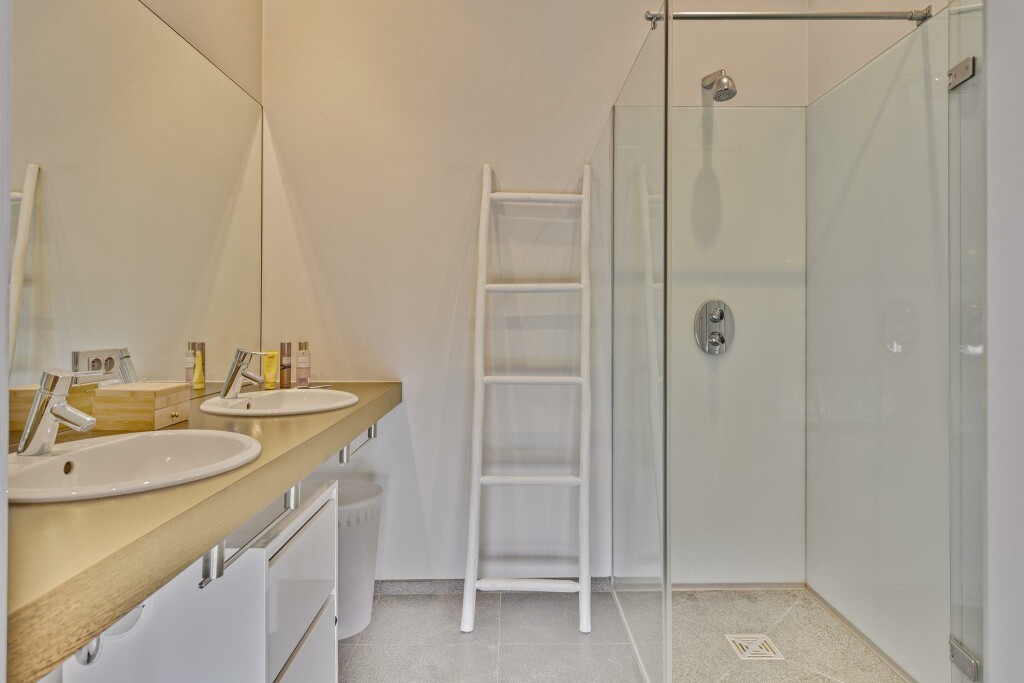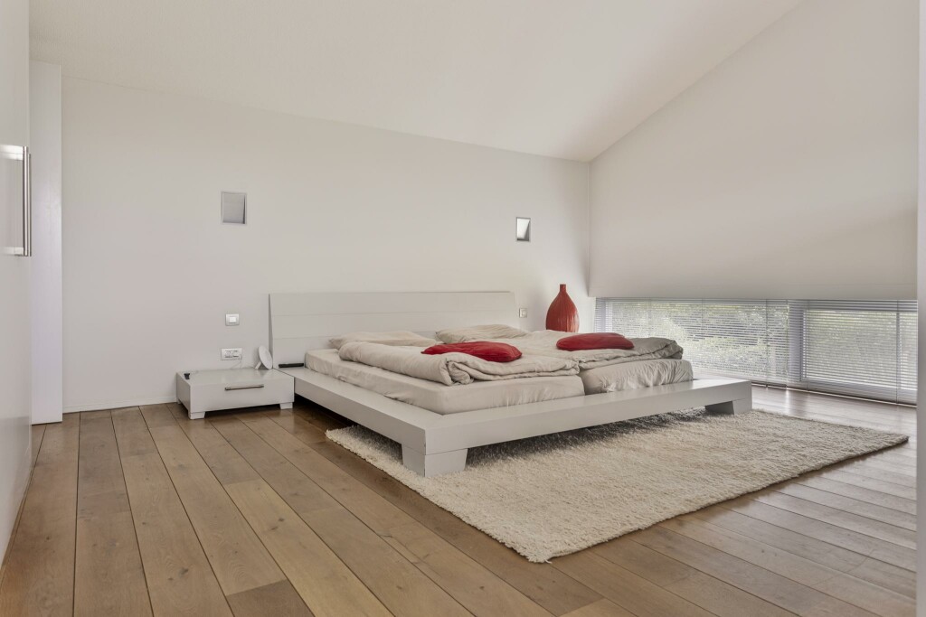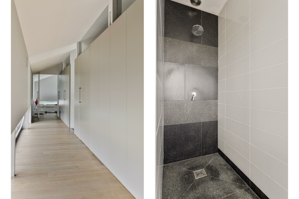 De master bedroom is een waar toevluchtsoord met een geïntegreerde werkhoek en een luxe en-suite badkamer, voorzien van ligbad, inloopdouche en op maat gemaakt wastafelmeubel. De bijzondere kapconstructie en strategisch geplaatste ramen creëren een speels lichtspel, waarbij het water van het zwembad subtiel weerkaatst op het plafond