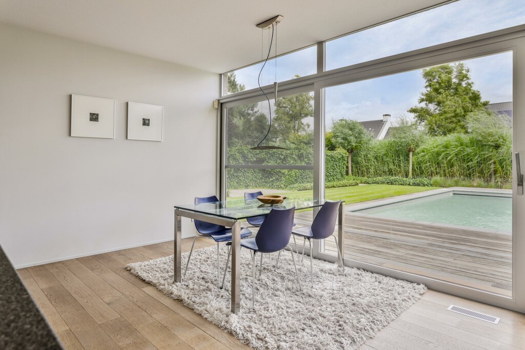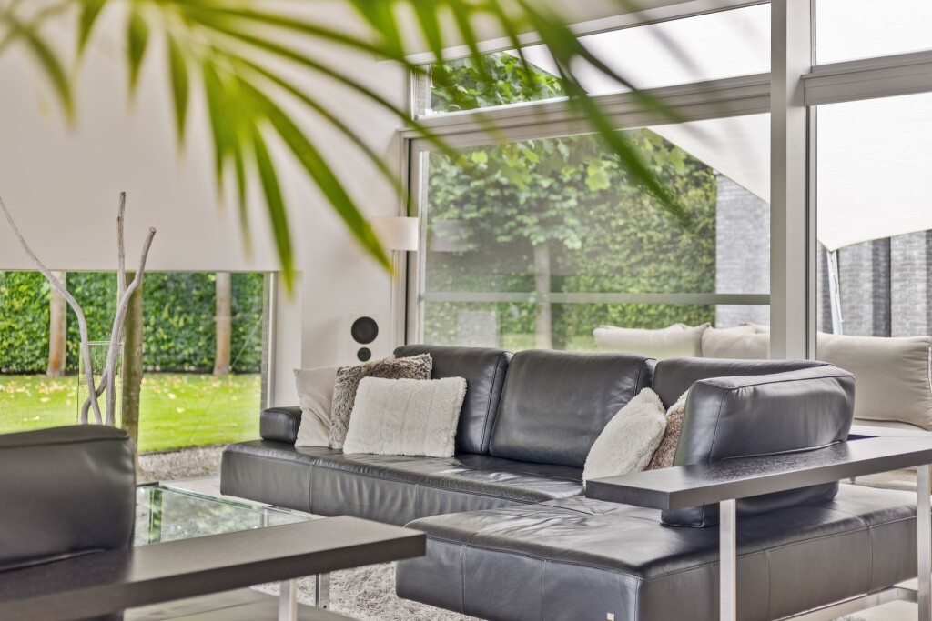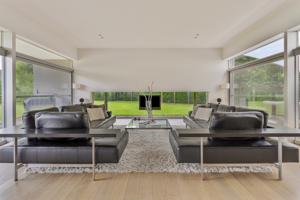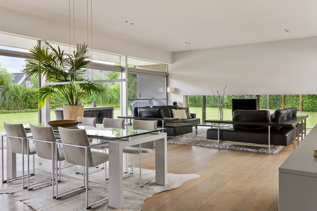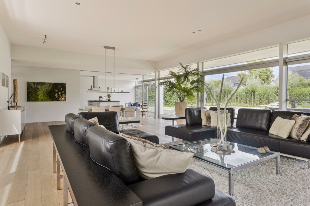 Een riante, tuingerichte woonkamer biedt rondom zicht op het groen en loopt dankzij de kamerhoge raampartijen moeiteloos over in de buitenruimte. Hierdoor ontstaat een heerlijk gevoel van vrijheid en verbinding met de natuur.