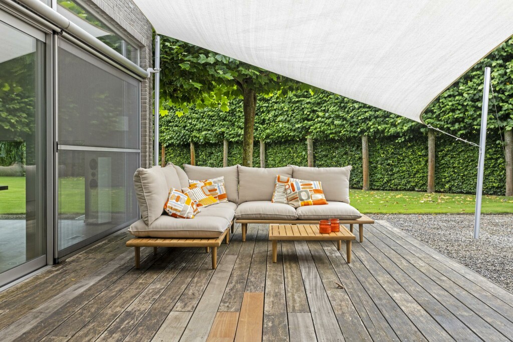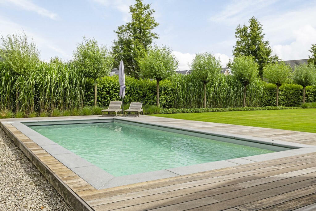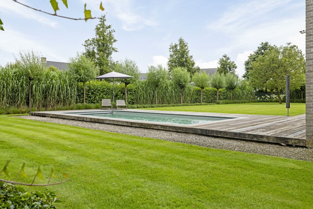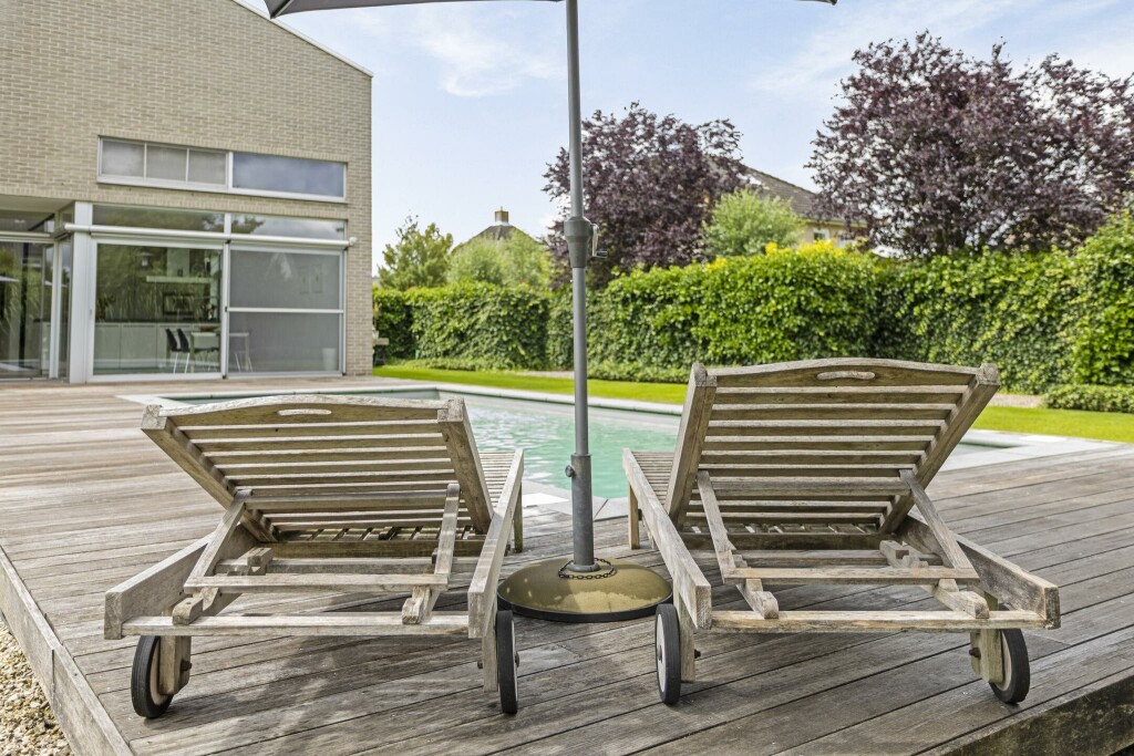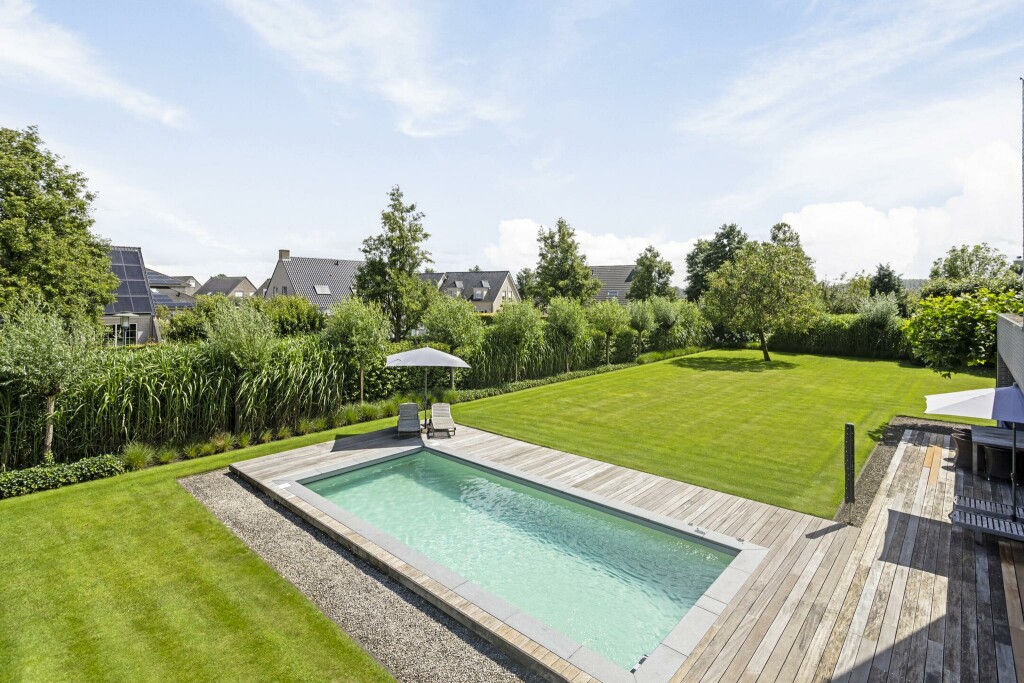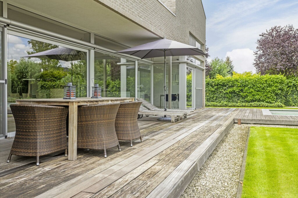 Centraal ligt het prachtige zwembad, harmonieus geïntegreerd in het terras dankzij stijlvolle houten vlonders. Een oase van rust en ontspanning.