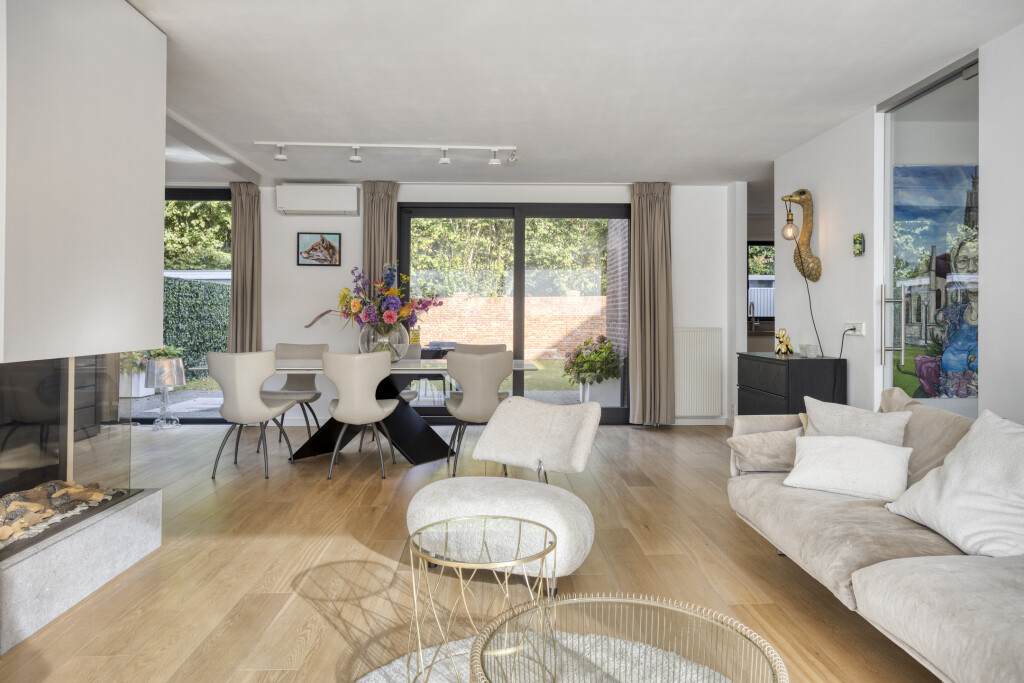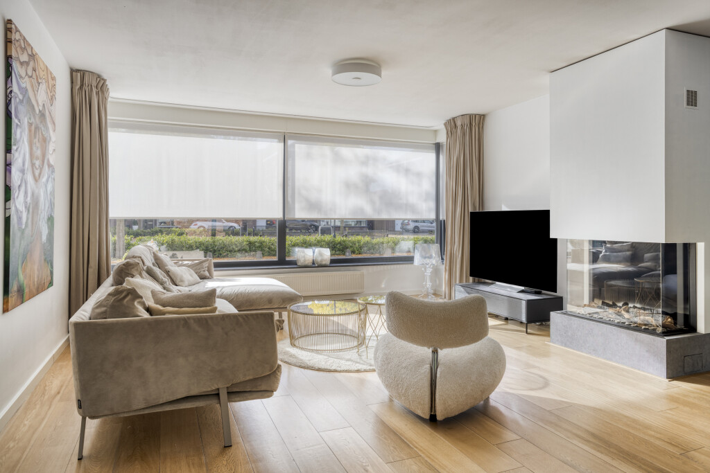De woonkamer is licht en ruimtelijk, met grote ramen die veel daglicht binnenlaten.
