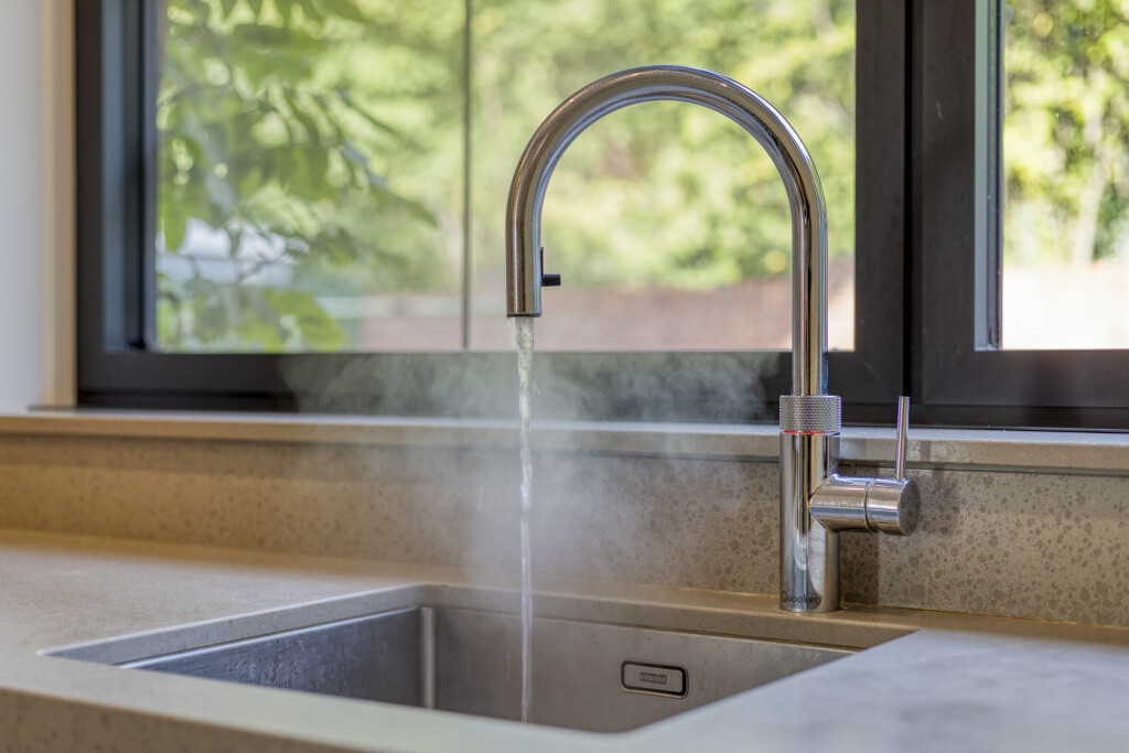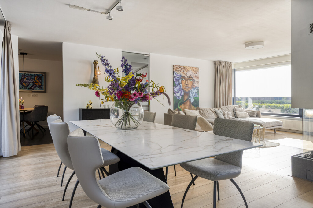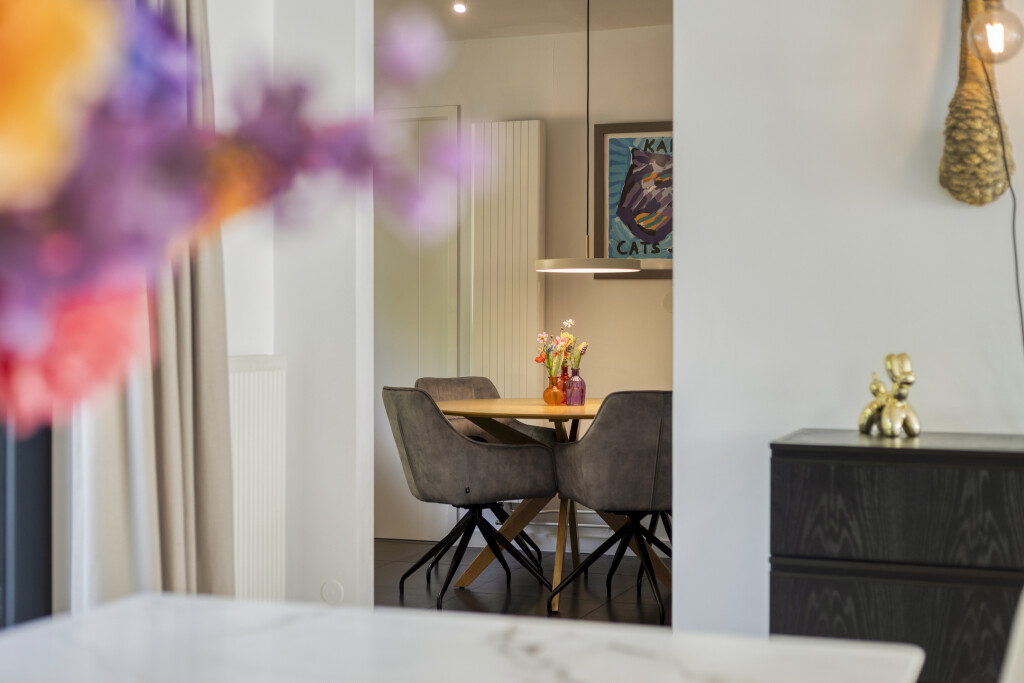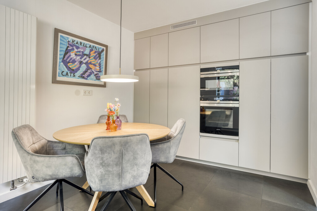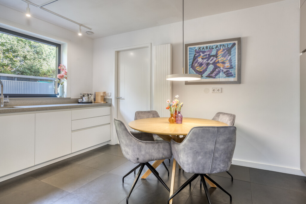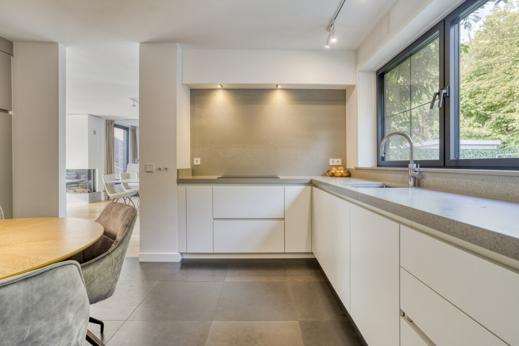 Grenzend aan de woonkamer bevindt zich de moderne keuken, die in 2023 volledig is gerenoveerd.