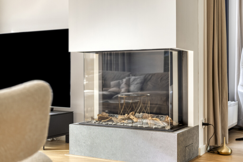 De fraaie parketvloer en de sfeervolle houthaard geven de ruimte een warme uitstraling.