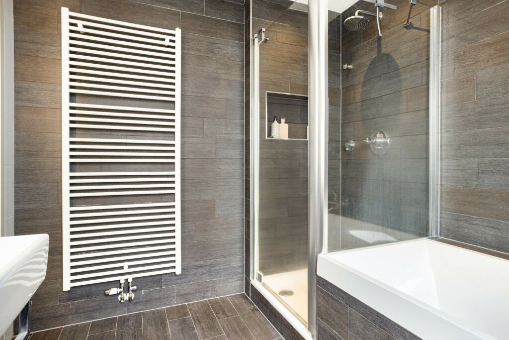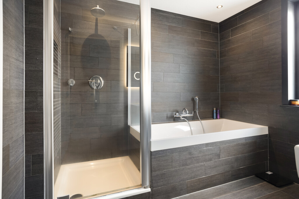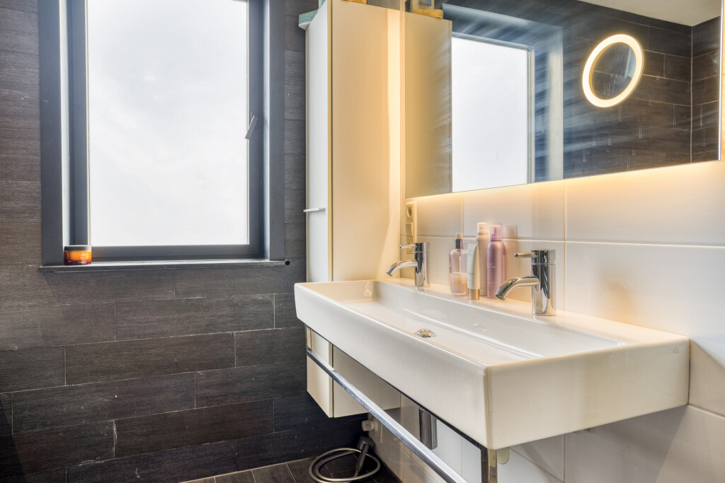 De moderne badkamer is voorzien van een ligbad, inloopdouche, dubbele wastafel met meubel en spiegel.