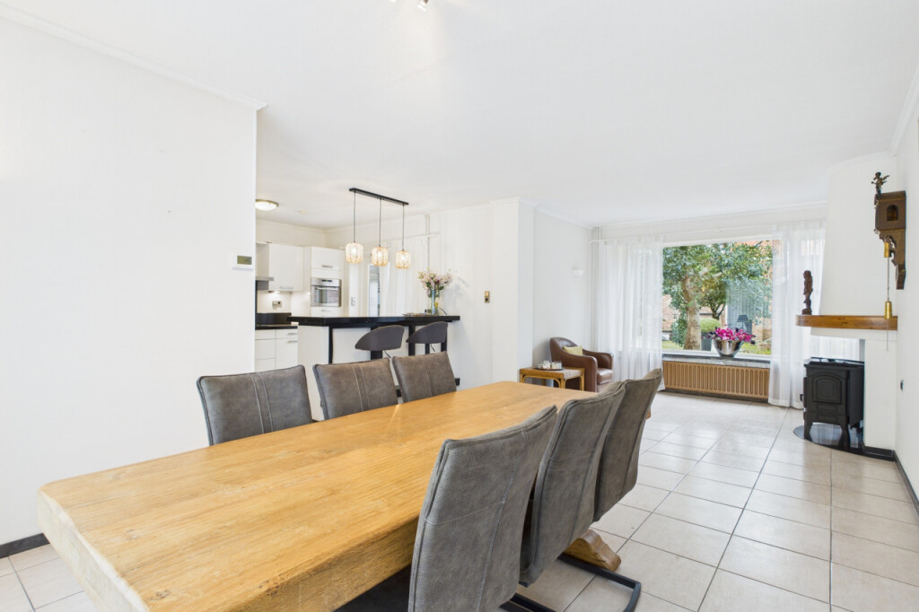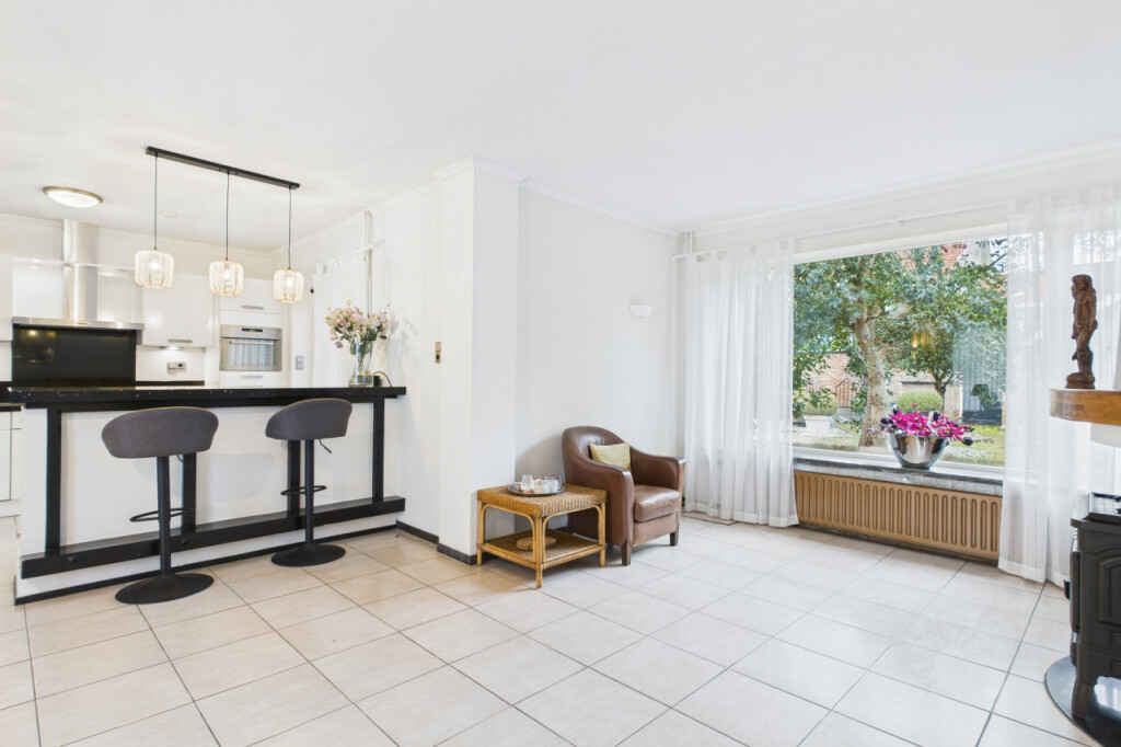 De hal met tegelvloer geeft toegang tot het toilet, de meterkast en de trap naar de verdieping. Via de hal loop je door naar de open keuken, die in een hoekopstelling is geplaatst en voorzien is van alle gemakken, waaronder een 4-pits gasfornuis, vaatwasser, koelkast en combi-oven. De bar vormt een gezellige plek voor een snelle koffie of een goed gesprek tijdens het koken. Vanuit de keuken stap je rechtstreeks de tuin in. De woonkamer is opvallend licht en sfeervol, mede dankzij de pelletkachel en de airco die zorgt voor een aangenaam binnenklimaat in elk seizoen.