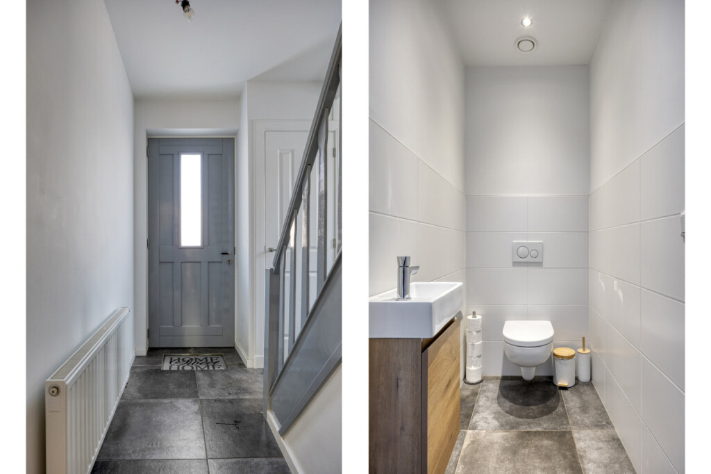 Via de entree kom je binnen in de hal met het toilet, de trapopgang naar de eerste verdieping en de doorgang naar de leefruimte. De begane grond is in 2019 volledig gerenoveerd en afgewerkt in een moderne, tijdloze stijl.