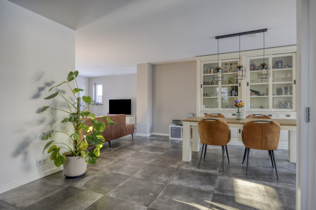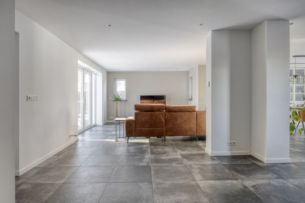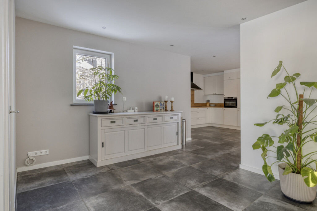 Over de gehele begane grond ligt een tijdloze grijze tegelvloer, voorzien van vloerverwarming, wat bijdraagt aan het strakke en comfortabele karakter van de woning.