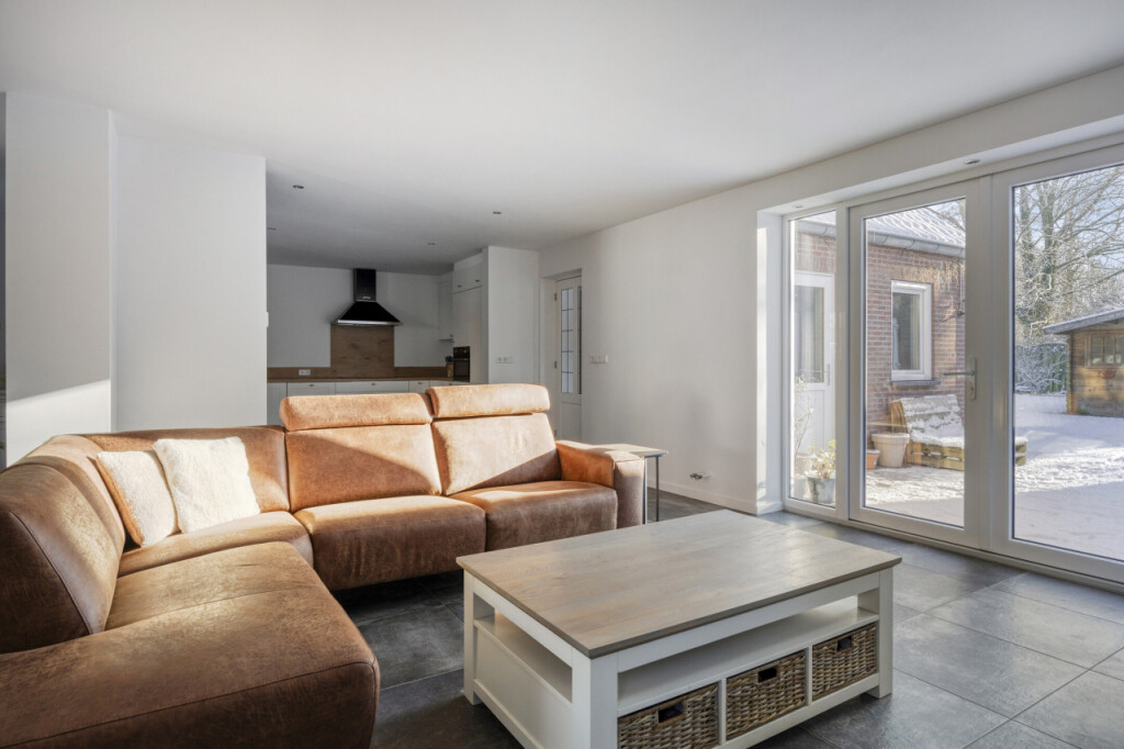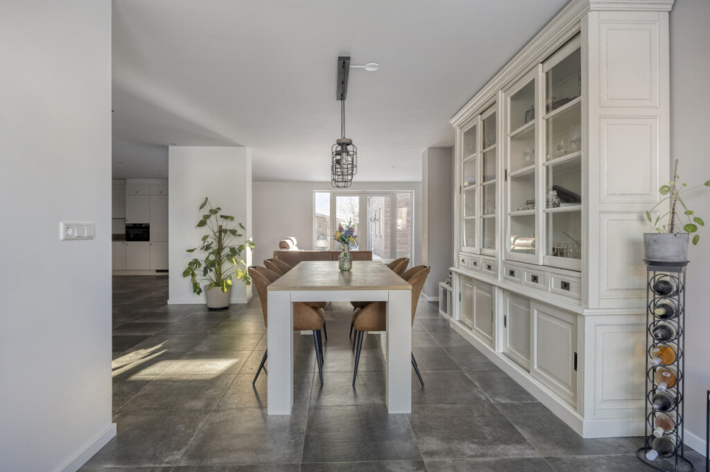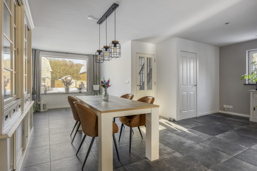 De ruime woonkamer is een heerlijke leefruimte met veel lichtinval. De tuindeuren geven direct toegang tot de royale achtertuin. Aan de voorzijde van de woning is voldoende ruimte voor een grote eettafel, een fijne plek om uitgebreid te tafelen en te genieten.