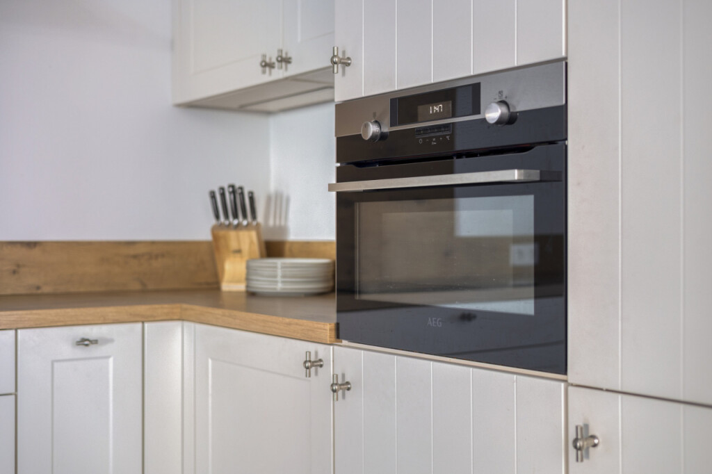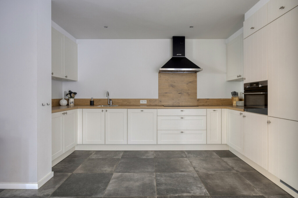 De keuken (2019) is uitgevoerd in een landelijke witte stijl die perfect aansluit bij de uitstraling van het huis. De keuken is compleet uitgerust met een inductiekookplaat, koelkast, combi-oven, vaatwasser en afzuigkap.