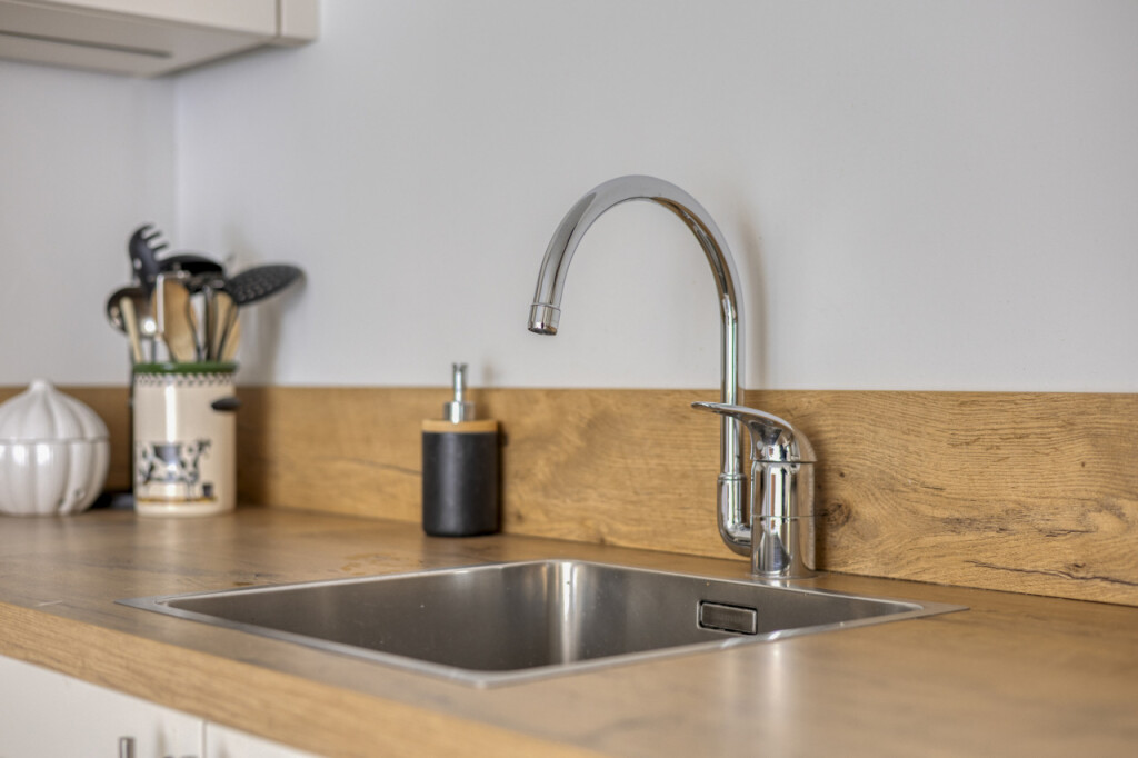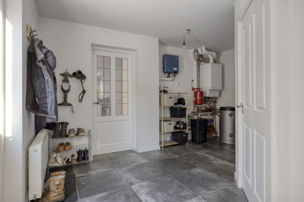 Aansluitend bevindt zich de bijkeuken, waar de installaties zijn gesitueerd, waaronder de hybride warmtepomp en de witgoedaansluitingen. Daarnaast is dit een praktische ruimte met voldoende plaats voor een garderobe en extra opslag.
