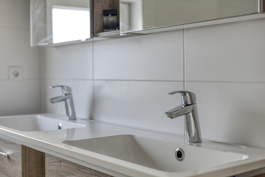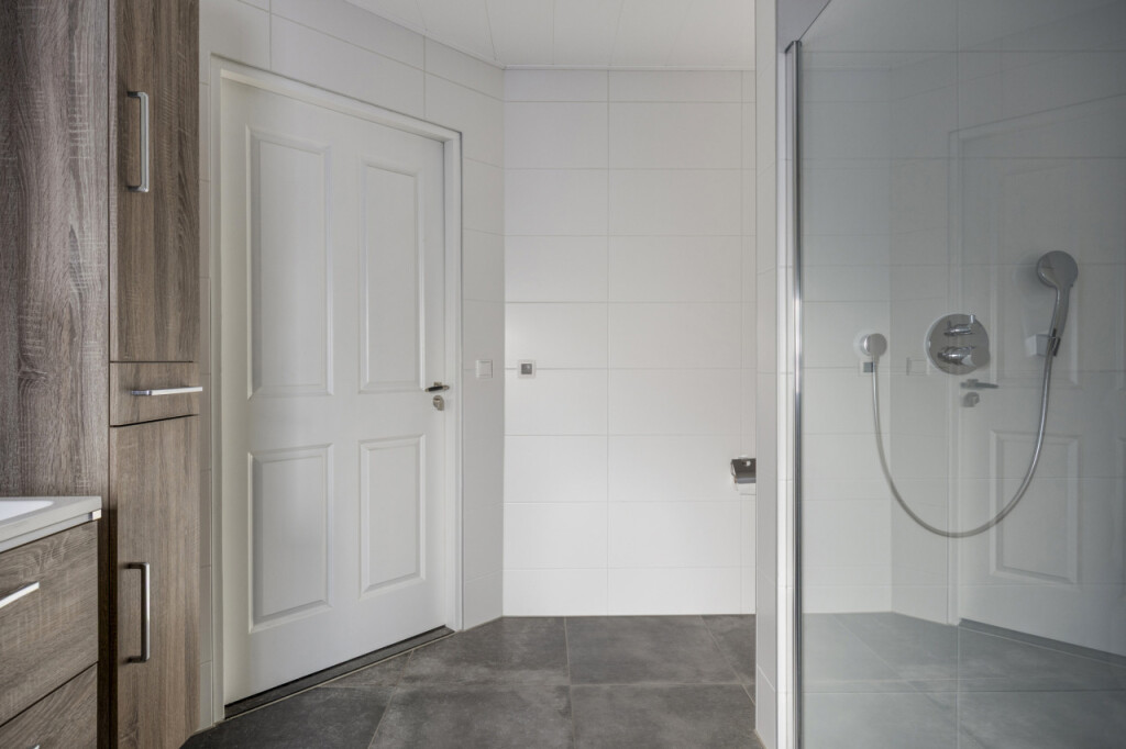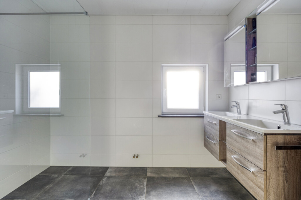 Vanuit de bijkeuken bereik je de badkamer op de begane grond, voorzien van een dubbele wastafel, een inloopdouche en een toilet.