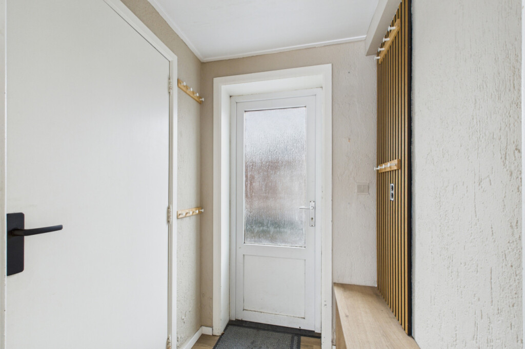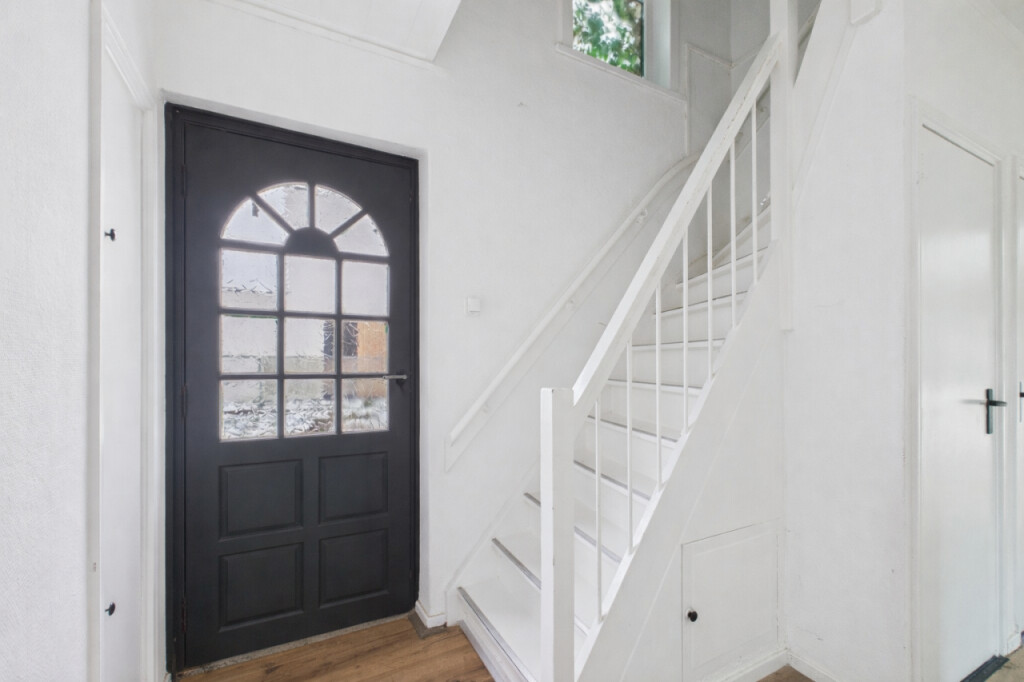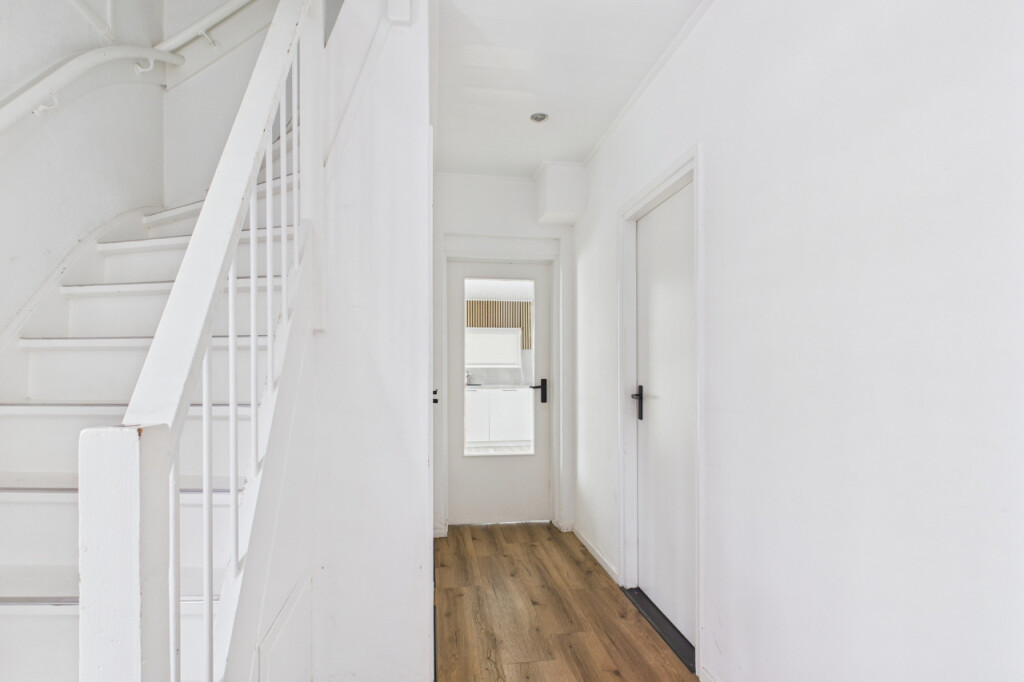 Via de entree kom je binnen in de hal, waar zich de meterkast, het toilet en de trapopgang naar de verdieping bevinden. Onder de trap is een praktische kelderkast aanwezig. Vanuit de hal heb je zowel toegang tot de woonkamer en de keuken. De ruime L-vormige woonkamer voelt warm en uitnodigend aan, mede dankzij de sfeervolle haard en de nette laminaatvloer. De dichte woonkeuken is royaal opgezet en voorzien van een modern keukenblok in een praktische hoekopstelling met de benodigde inbouwapparatuur. Vanuit de keuken bereik je een tussenportaal dat toegang geeft tot de moderne badkamer. Deze is ingericht met een inloopdouche, een wastafel met meubel, een bergkast en een designradiator. Ook zijn hier de aansluitingen voor de witgoedapparatuur te vinden. Vanuit dit portaal geeft de achterdeur toegang tot de tuin.