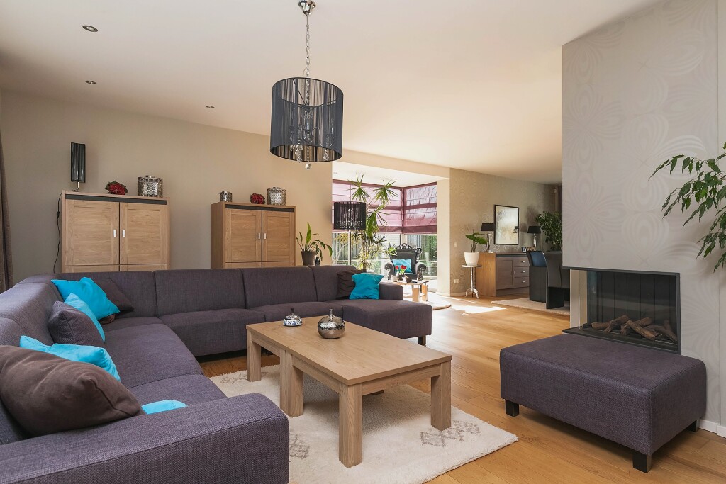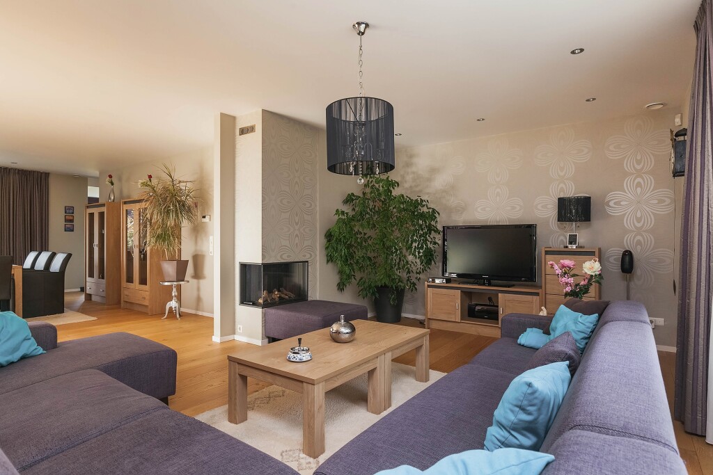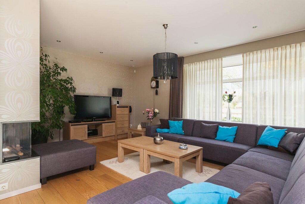 - Doorzon woonkamer met haard en schuifpui naar de tuin