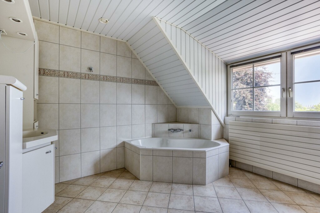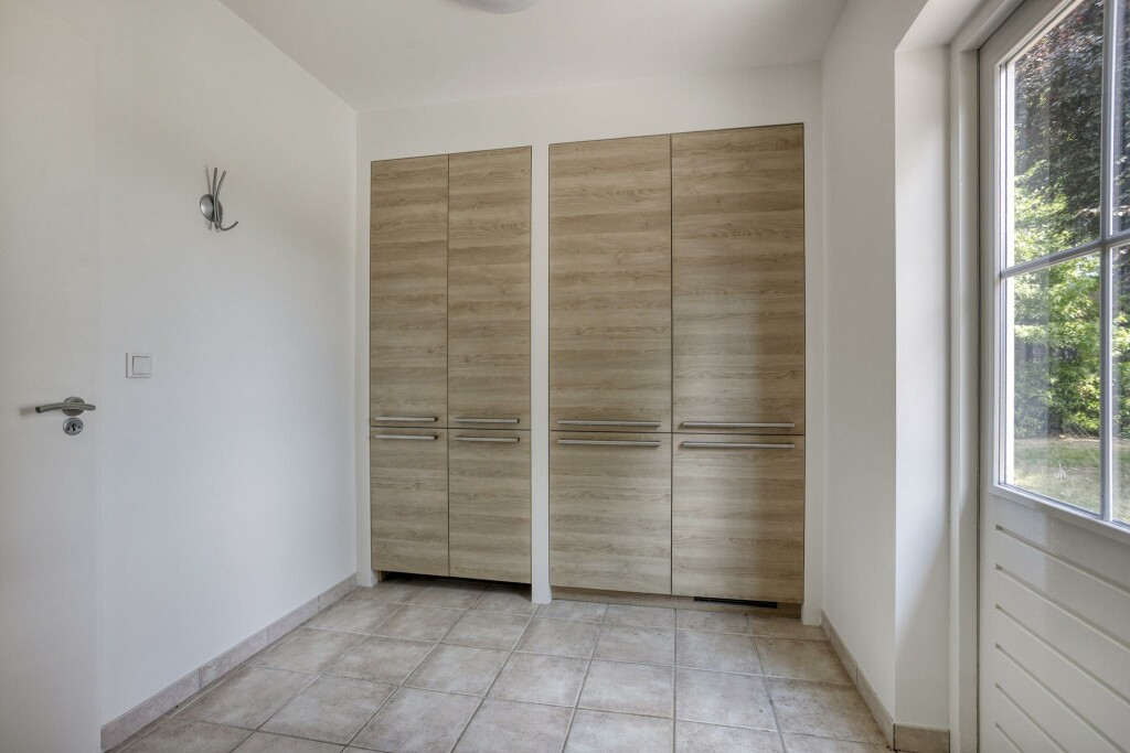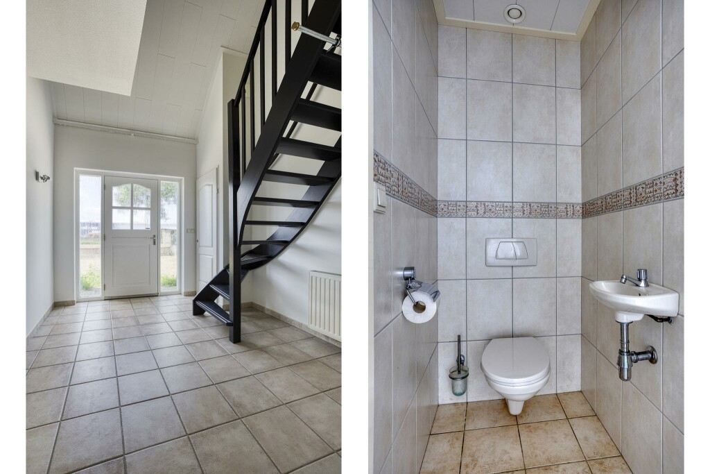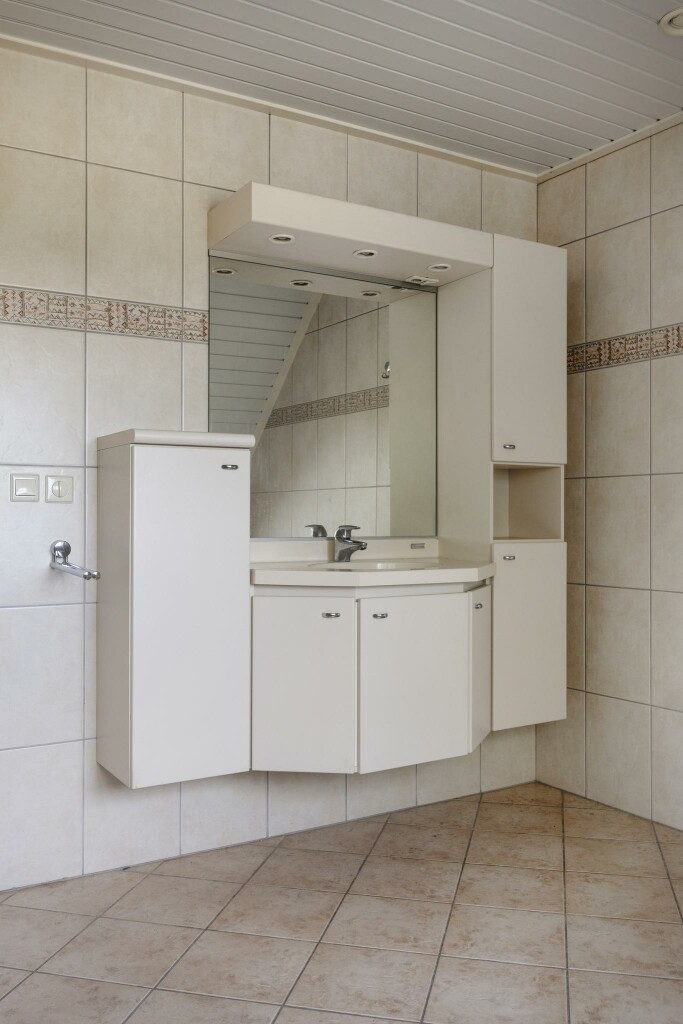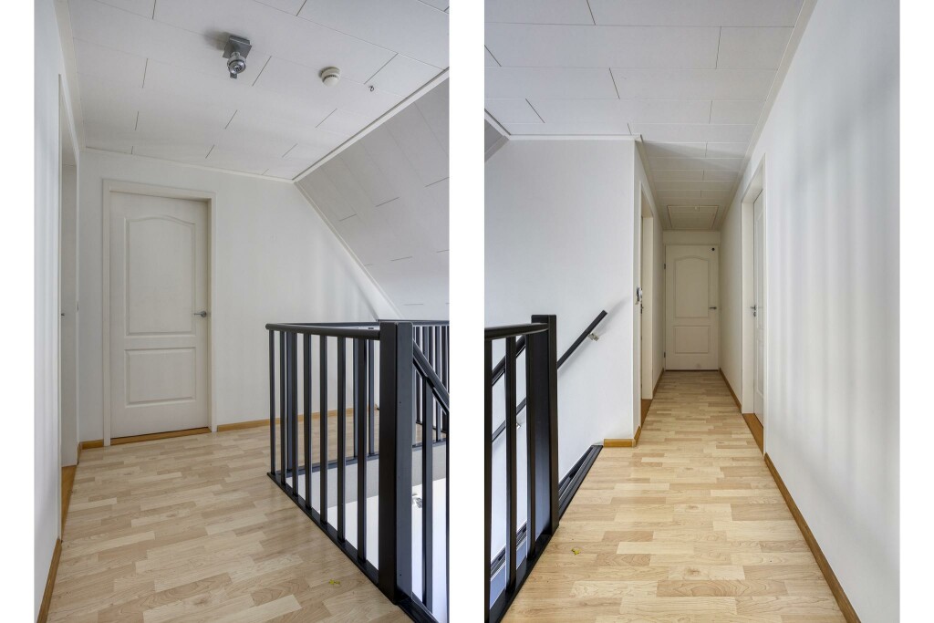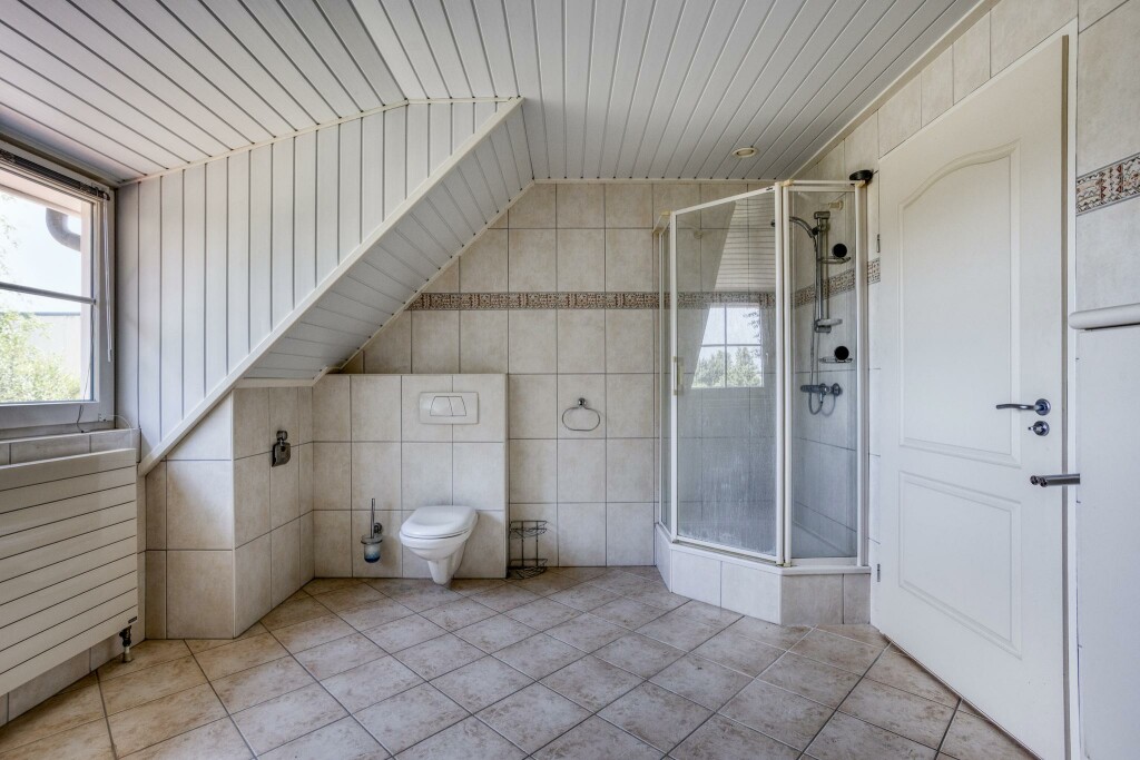 De eerste verdieping is ingedeeld met de overloop, drie slaapkamers, ruime badkamer en de technische ruimte. In de badkamer bevind zich een douche, bad, toilet en wastafel meubel.