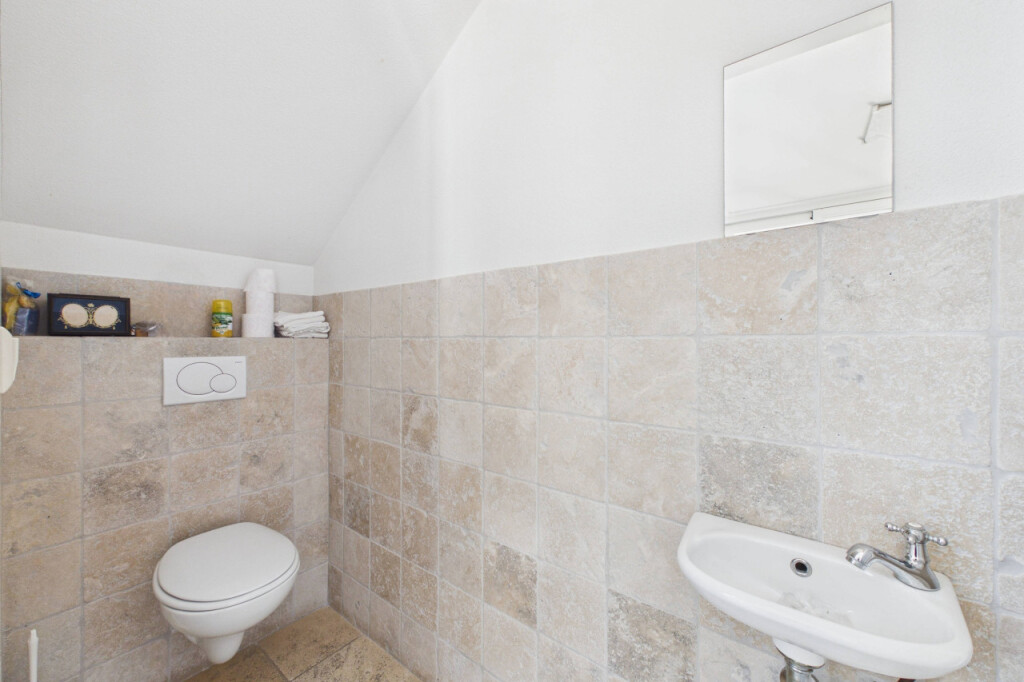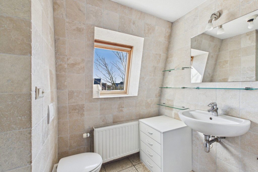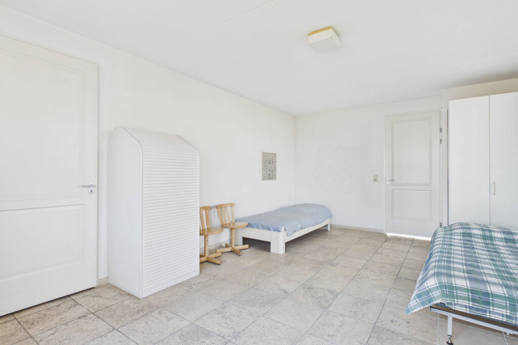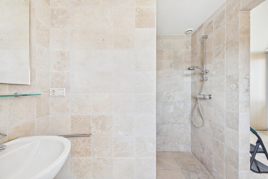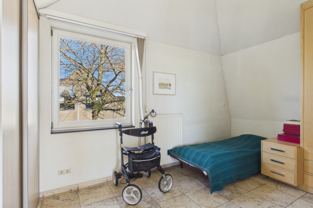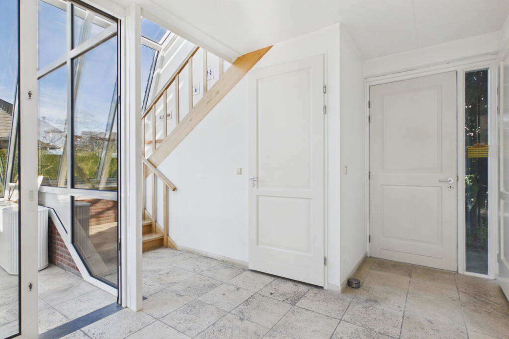 Je komt de woning binnen in de hal, waar zich de meterkast, het toilet met fonteintje en de trapopgang naar de verdieping bevinden. Vanuit de hal heb je toegang tot de serre, die een fijne verbinding vormt tussen binnen en buiten. Op de begane grond bevinden zich daarnaast twee ruime slaapkamers. Eén van deze kamers kan gebruikt worden als slaapkamer/hobbykamer en beschikt over een badkamer ensuite, ingericht met een inloopdouche en wastafel. Vanuit deze kamer heb je tevens directe toegang tot de achtertuin. De tweede slaapkamer heeft toegang tot de bijkeuken en ook directe toegang tot de zijtuin.