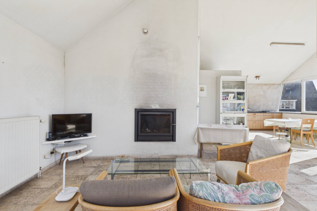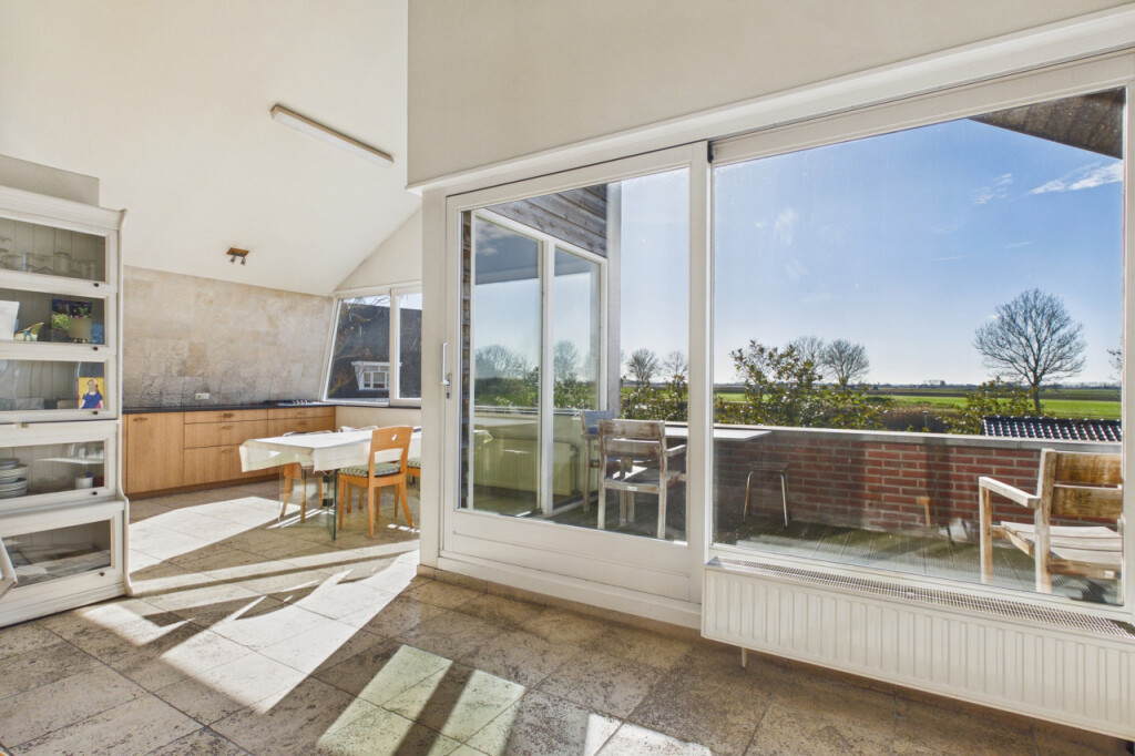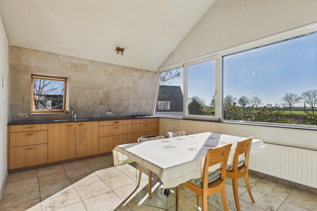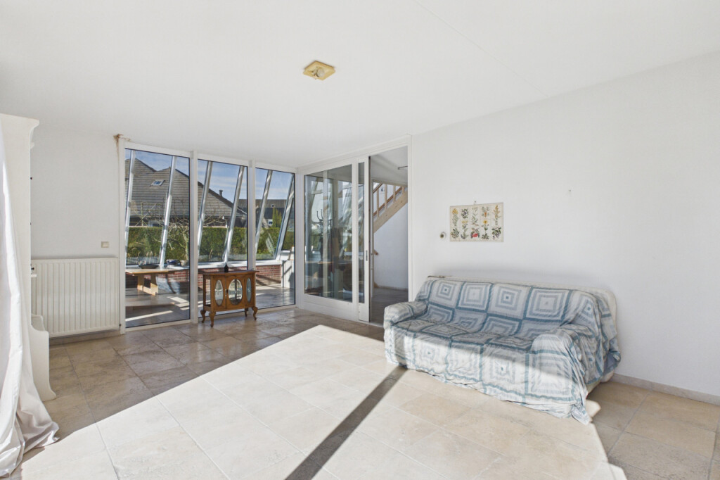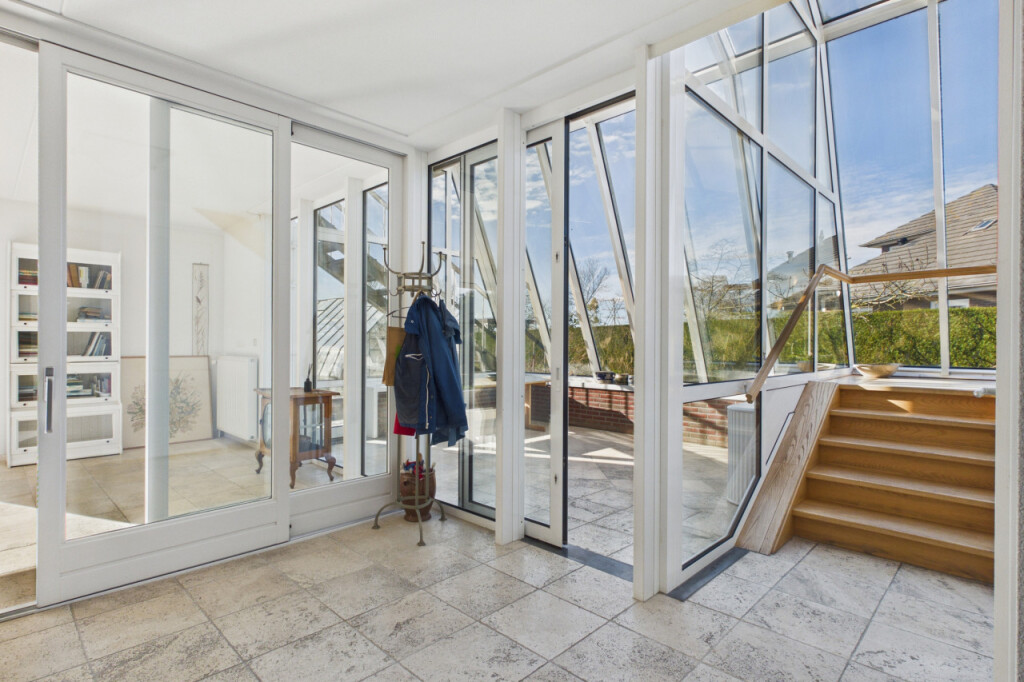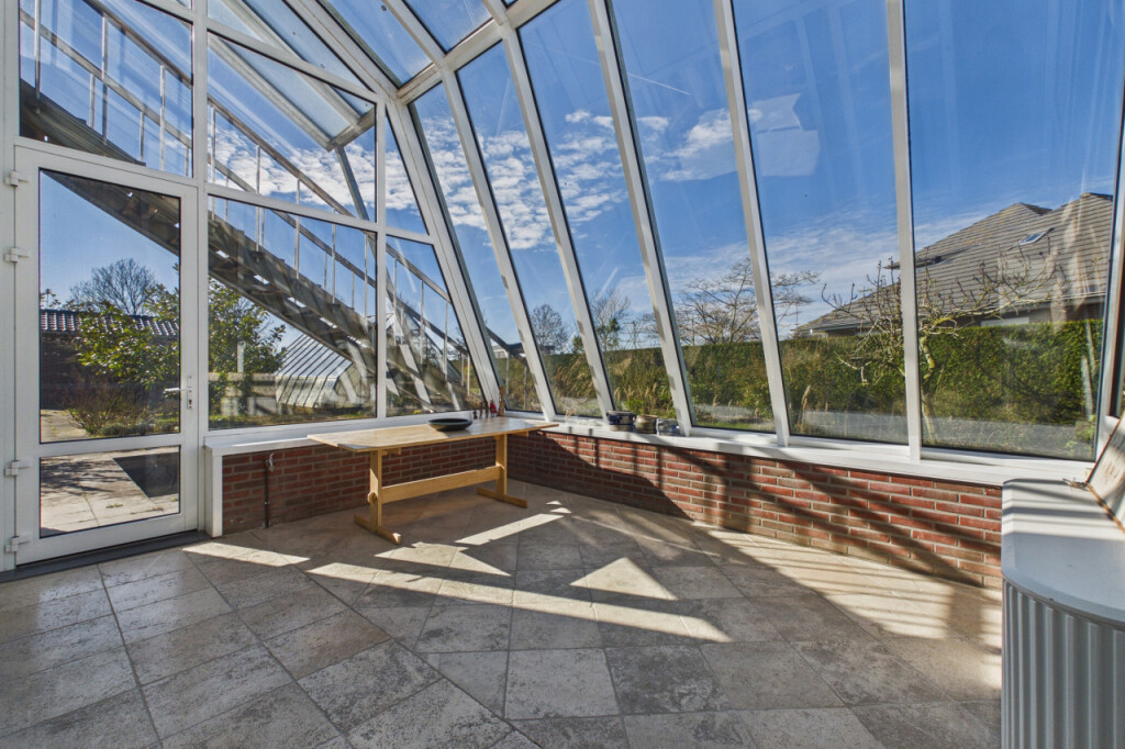 - Rondom voorzien deels (hard) houten kozijnen en deels aluminium kozijnen met dubbelglas