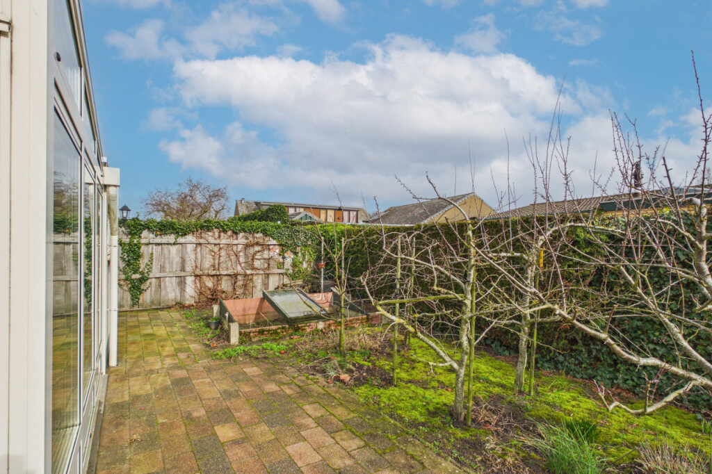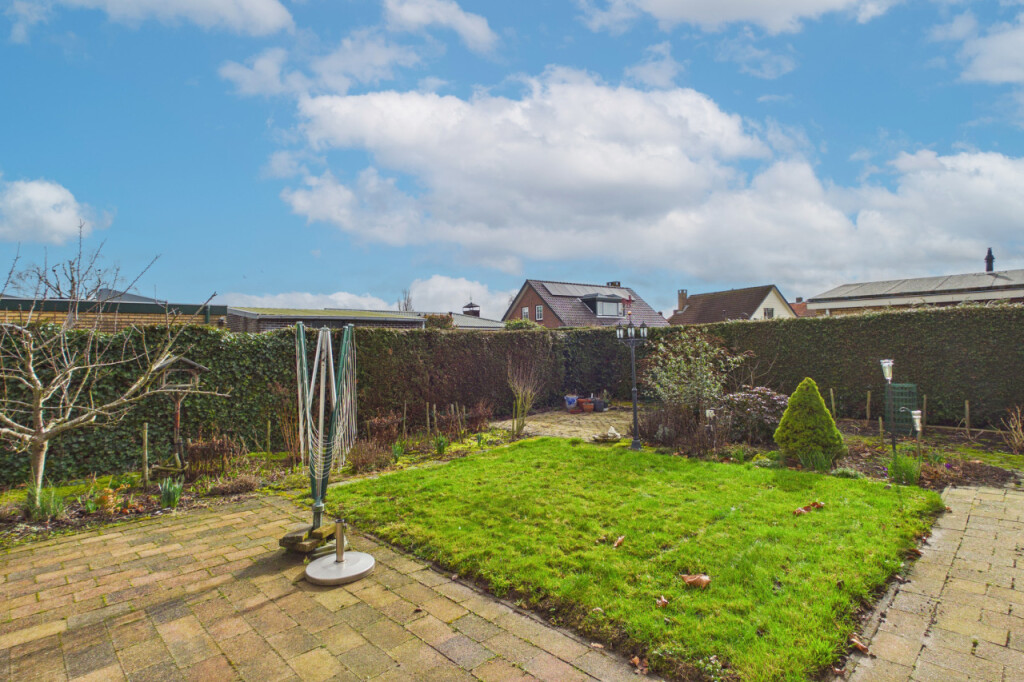 Rondom de woning ligt een royale tuin, waarvan het grootste gedeelte is gesitueerd op het noordoosten. De tuin is aangelegd met diverse terrassen, een gazon en verschillende bloem- en plantenborders, waardoor je op elk moment van de dag een fijn plekje in de zon of schaduw kunt vinden. Daarnaast is er een houten berging aanwezig voor extra opslag. Dankzij het ruime perceel geniet je hier van volop privacy en mogelijkheden om de tuin geheel naar eigen wens in te richten.