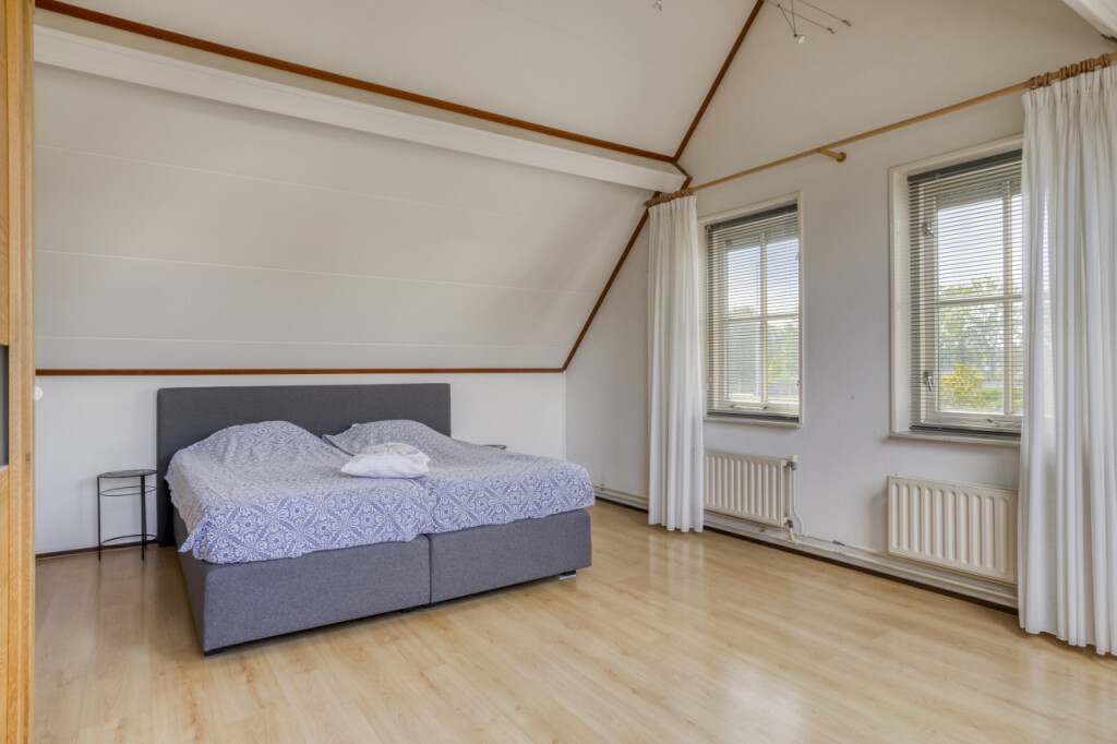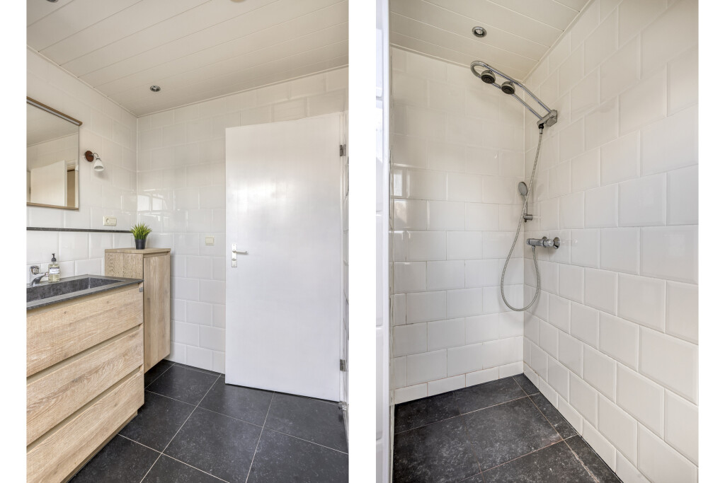 Op de eerste verdieping ervaar je rust en ruimte. De twee slaapkamers beslaan de volle breedte van de woning en zijn licht en comfortabel, met voldoende plek voor een groot bed, kasten en een werkhoek. De badkamer is netjes en functioneel ingericht met een douche, wastafel en toilet, en vormt een praktische ruimte voor het dagelijkse gemak.