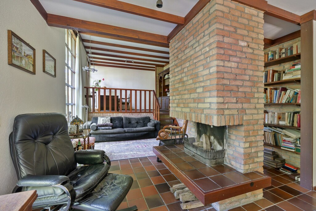 Entree in de ruime hal met toilet en meterkast. De ruime woonkamer heeft veel lichtinval door de vele ramen en heeft een fraaie open haard en een schuifpui naar de tuin. Via een trapje kom je op een verhoogde ruimte welke in gebruik is als werkruimte, met uitkijk op de tuin en de woonkamer.