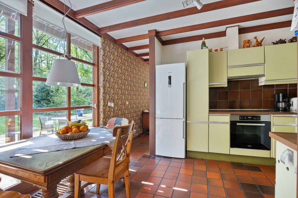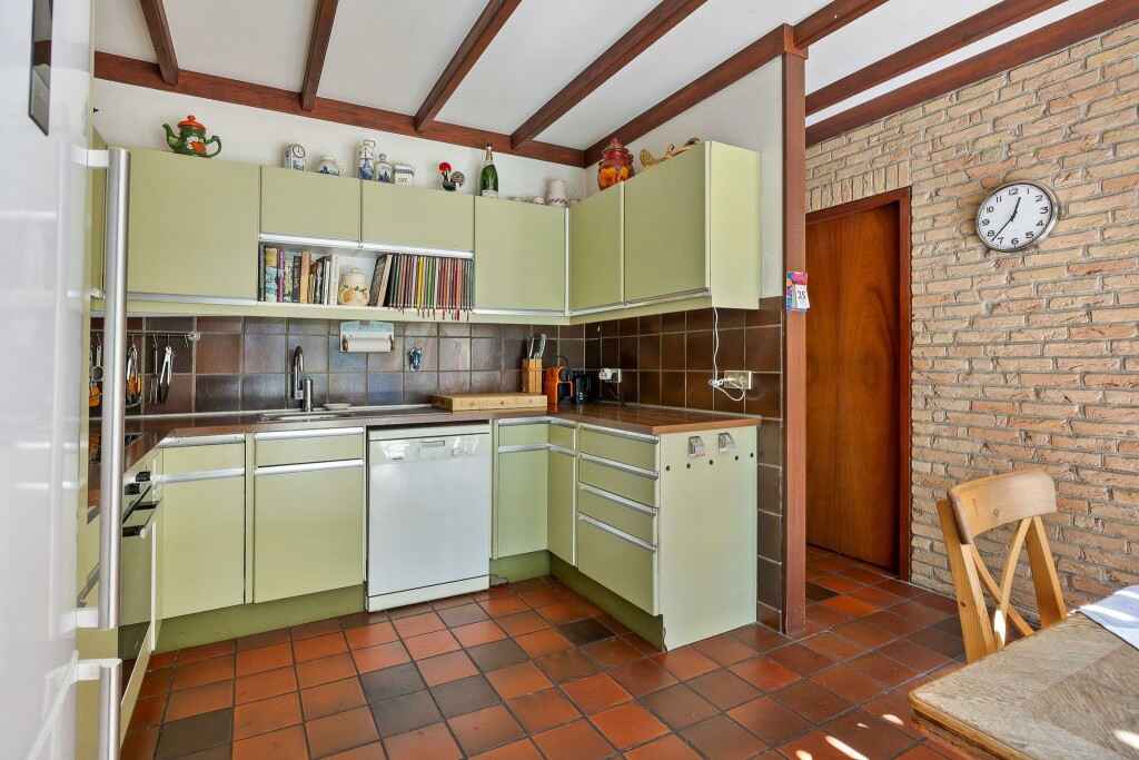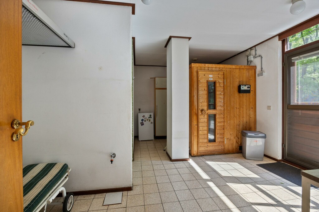 Vanuit de woonkamer is er een ruime eetkamer met toegang tot de halfopen leefkeuken. De keuken is eenvoudig en heeft een hoekopstelling voorzien een 4-pits elektrisch fornuis met afzuigkap, vaatwasser en koelkast met vriezer. Vanuit de keuken een schuifpui naar de tuin en toegang tot een ruime bijkeuken/saunaruimte. Deze ruimte heeft een eigen doucheruimte, sauna en solarium met een deur naar de tuin. Via een halletje is er toegang tot de kelder, een wasruimte en een c.v-ruimte. Aan het einde van de gang is er een deur naar de grote dubbele garage en grote berging.