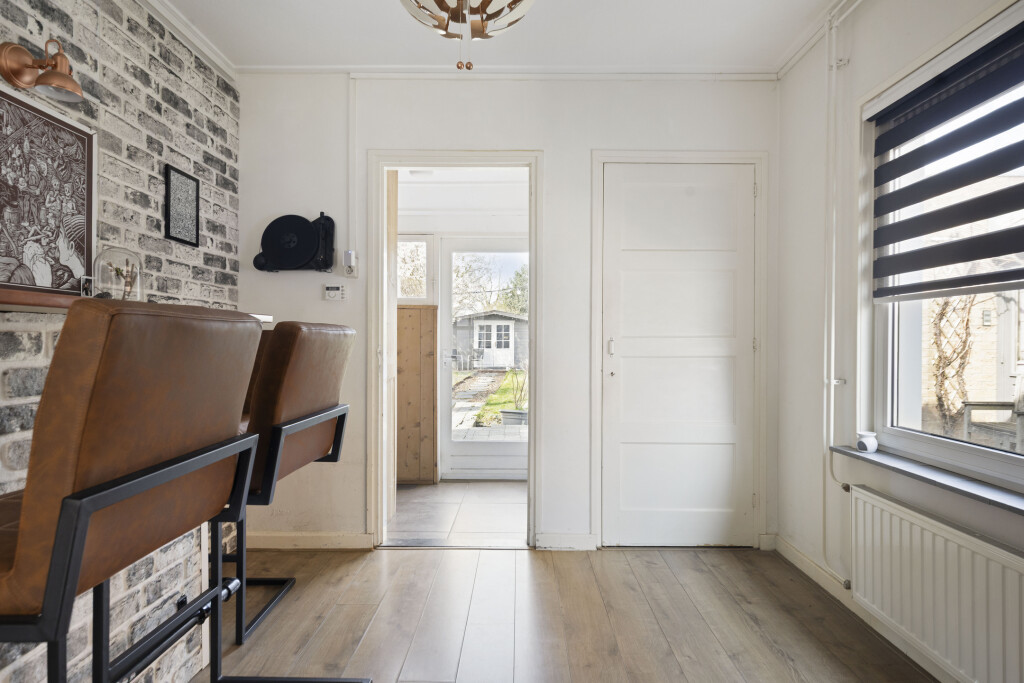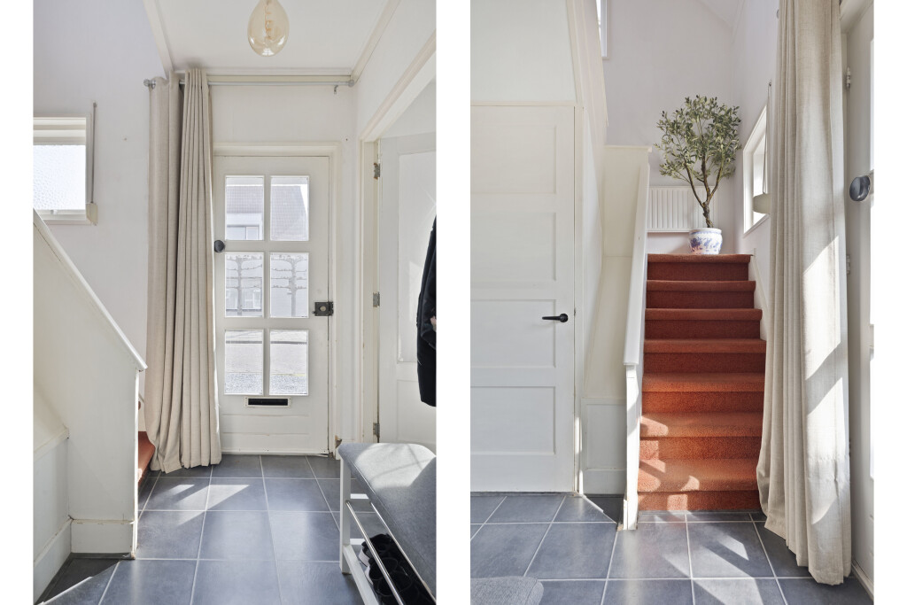Entree via de hal met meterkast, praktische trapkast en karakteristieke bordestrap naar eerste verdieping. Vanuit de hal heb je toegang tot de woonkamer en de eetkamer met bar.
